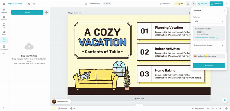 1. When using the audio provided by MiriCanvas and downloading to MP4, click on the 'YouTube Copyright policy' item in the download pop-up window.