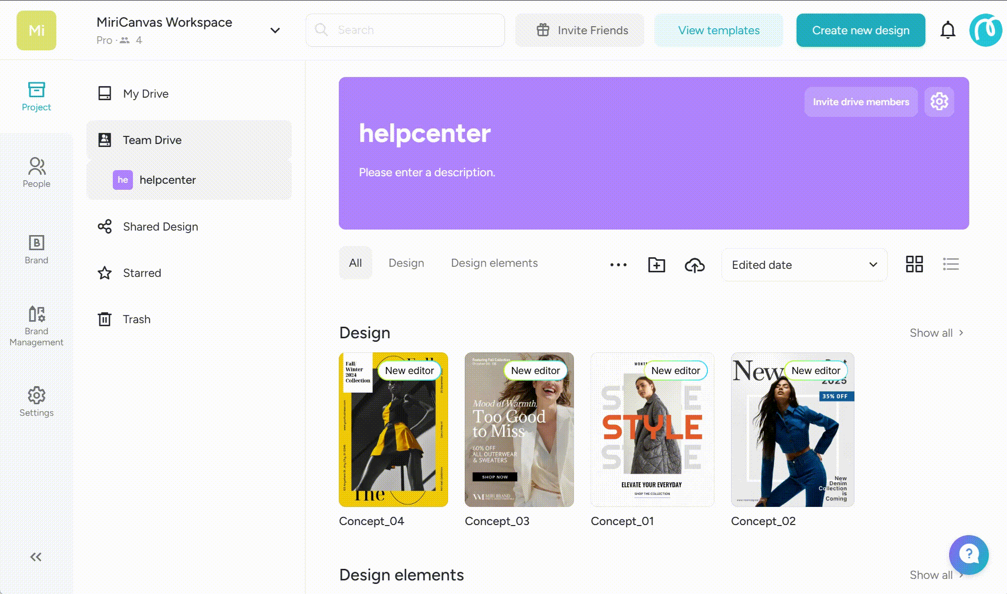 However, only Team Drive administrators or members with Manager access can create folders and manage designs and elements within them.