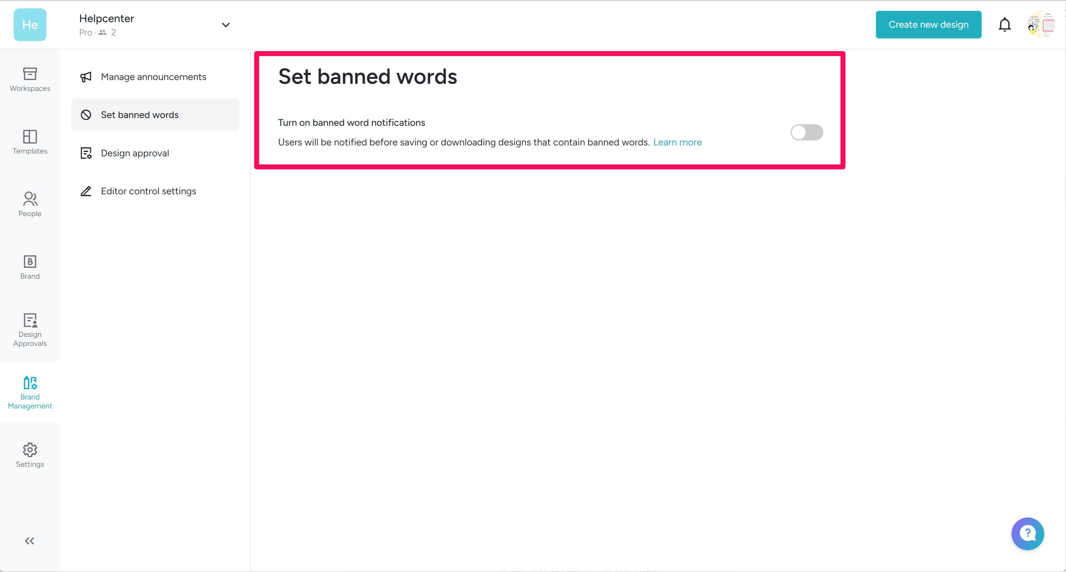 Workspace Team owner and Team admin can set and manage prohibited words that should not be used in designs.