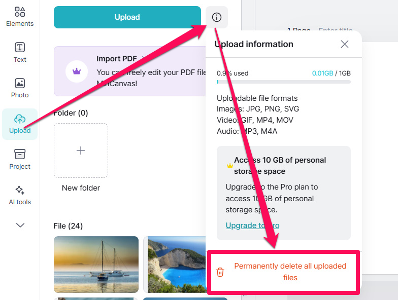 In the editor, go to Uploads → ⓘ Upload Infomation → Click “Permanently delete all uploaded files.”