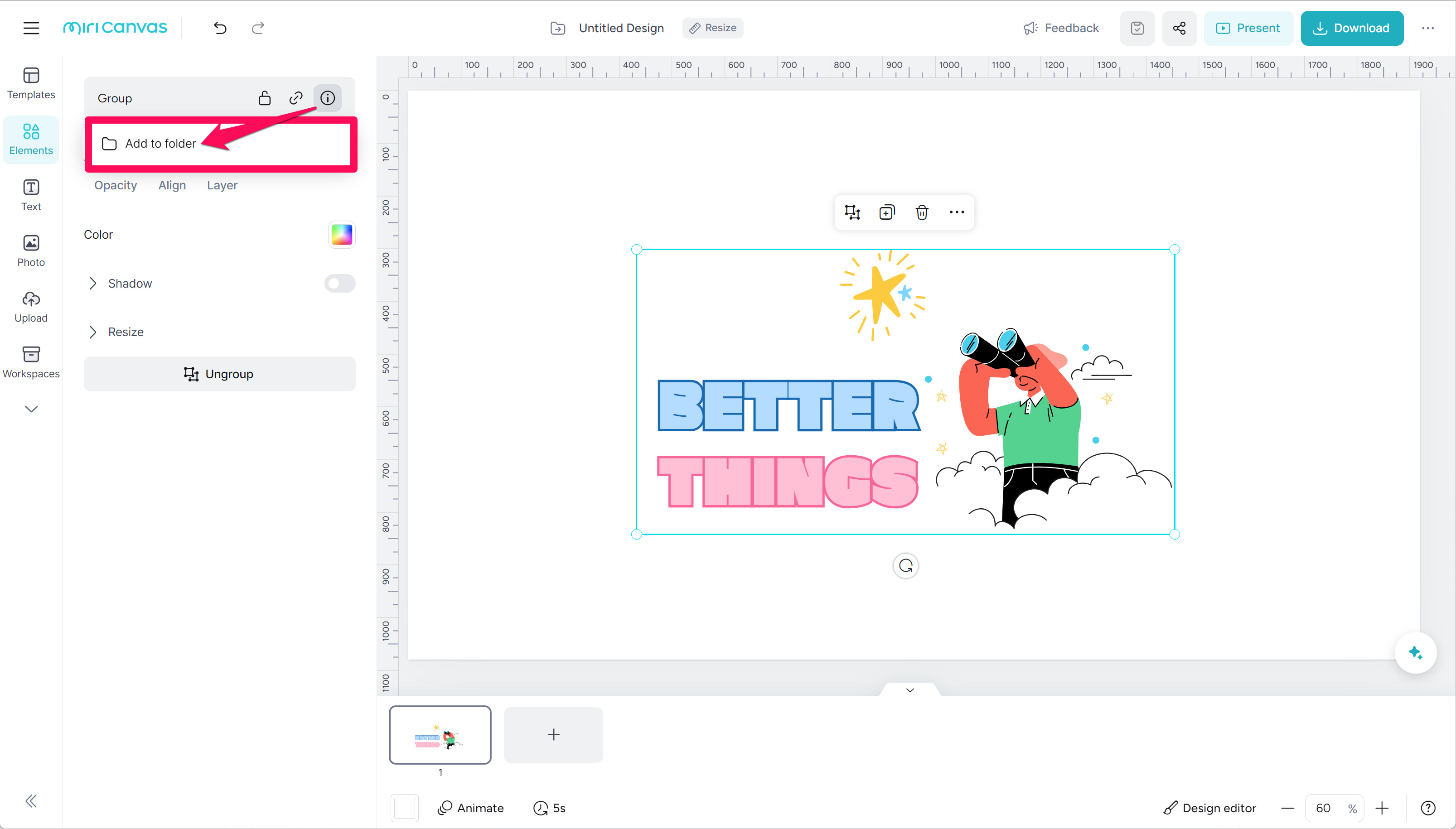 2. elect the grouped element, then click on the element information (ⓘ) at the top left of the menu, and choose "Add to Folder."