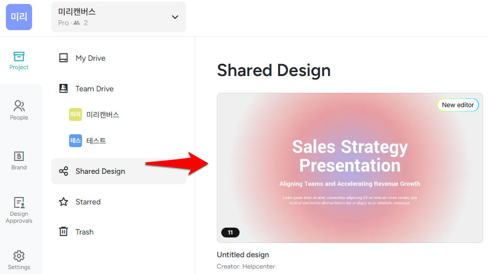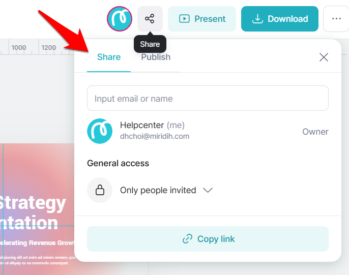 With the [Share Design] feature, you can invite workspace members to collaborate on a design stored in your drive.