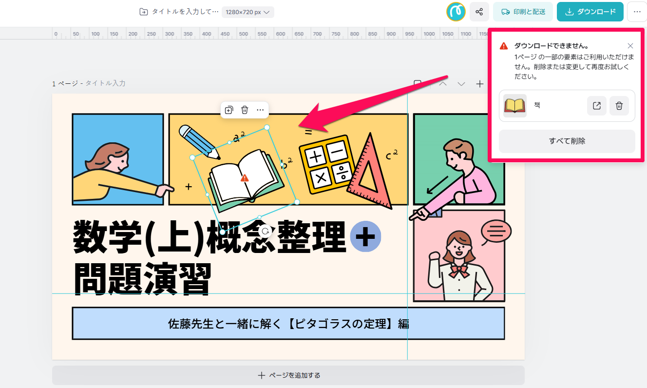 そのため、デザイン文書内で使用されている「未対応の素材」を削除しないと、保存やダウンロードを行うことができません。