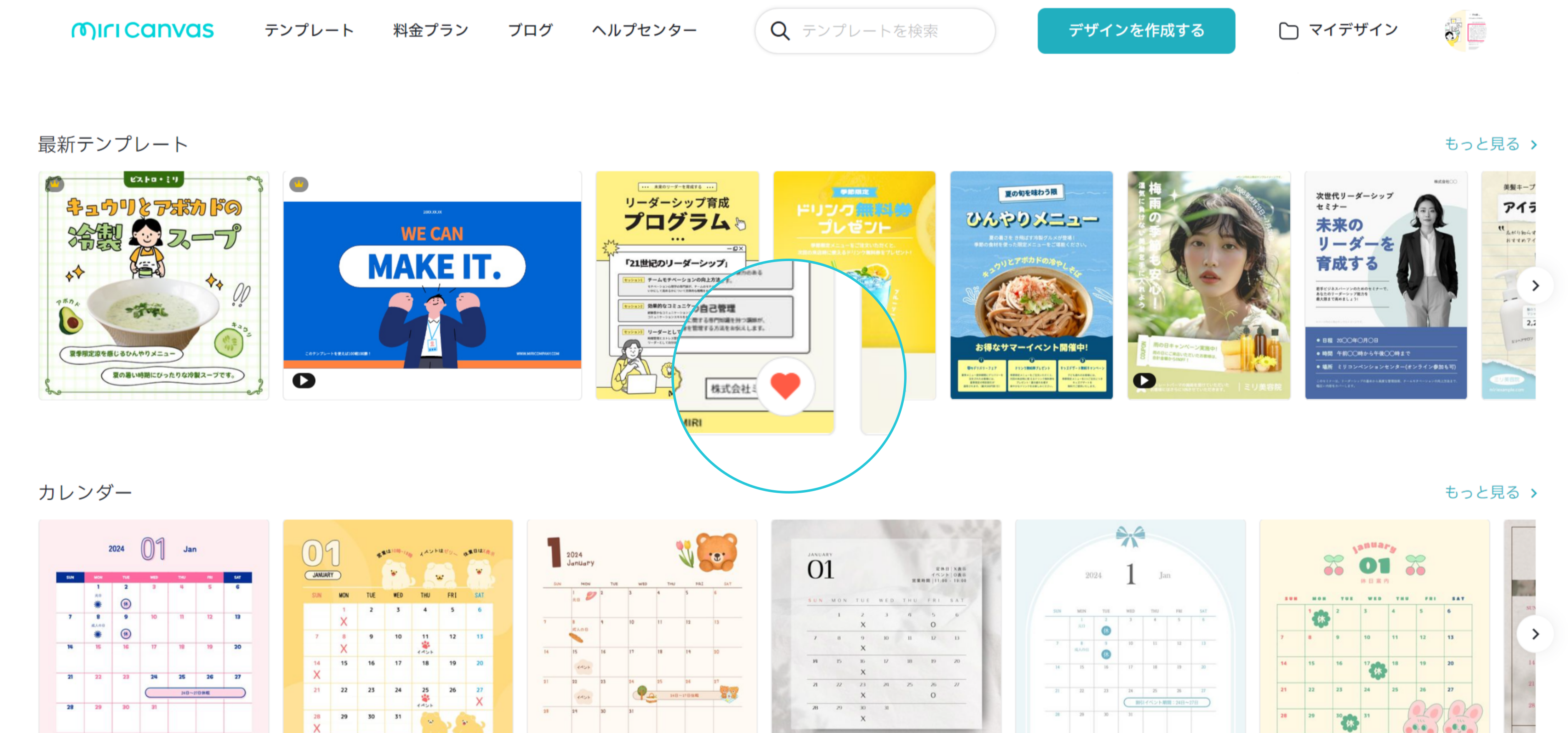 お気に入りに登録したテンプレートと素材はエディターで確認できますが、テンプレートの場合はホームページでも確認することができます。