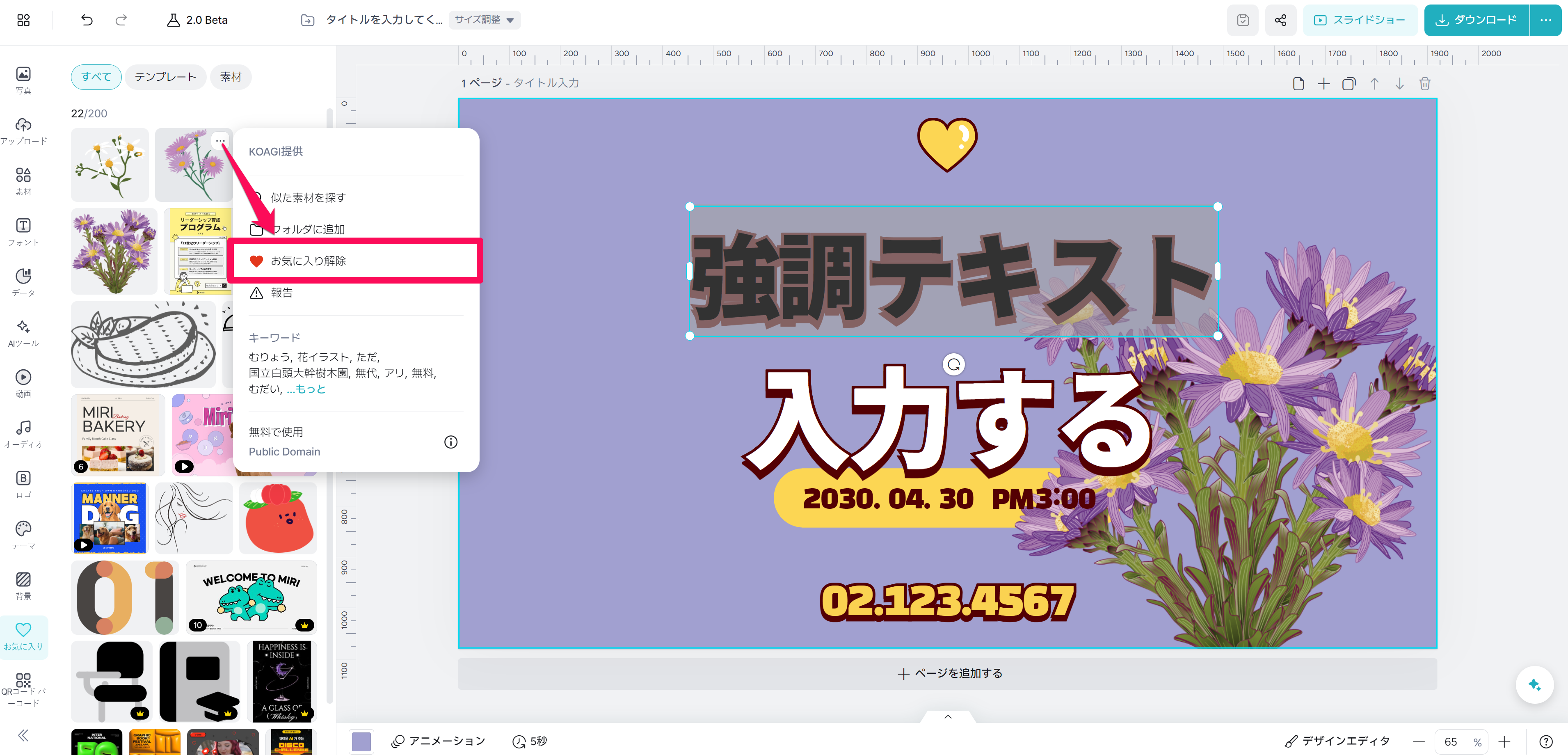 そんな時、お気に入り機能でテンプレートや素材を保存しておけば、次回デザインを作成する際に簡単に使用する事が出来ます。