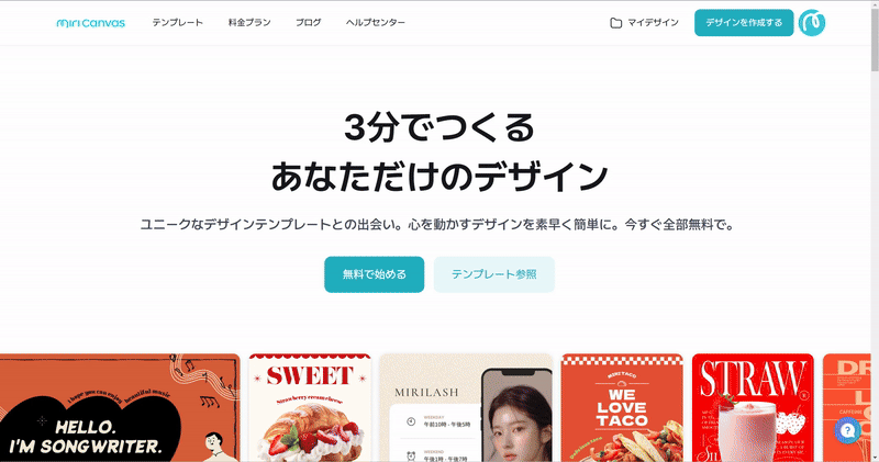 テンプレートは、テンプレートページとエディター[テンプレート]メニューから選択する事ができ、素材はエディターの[素材]メニューからお選びいただけます。