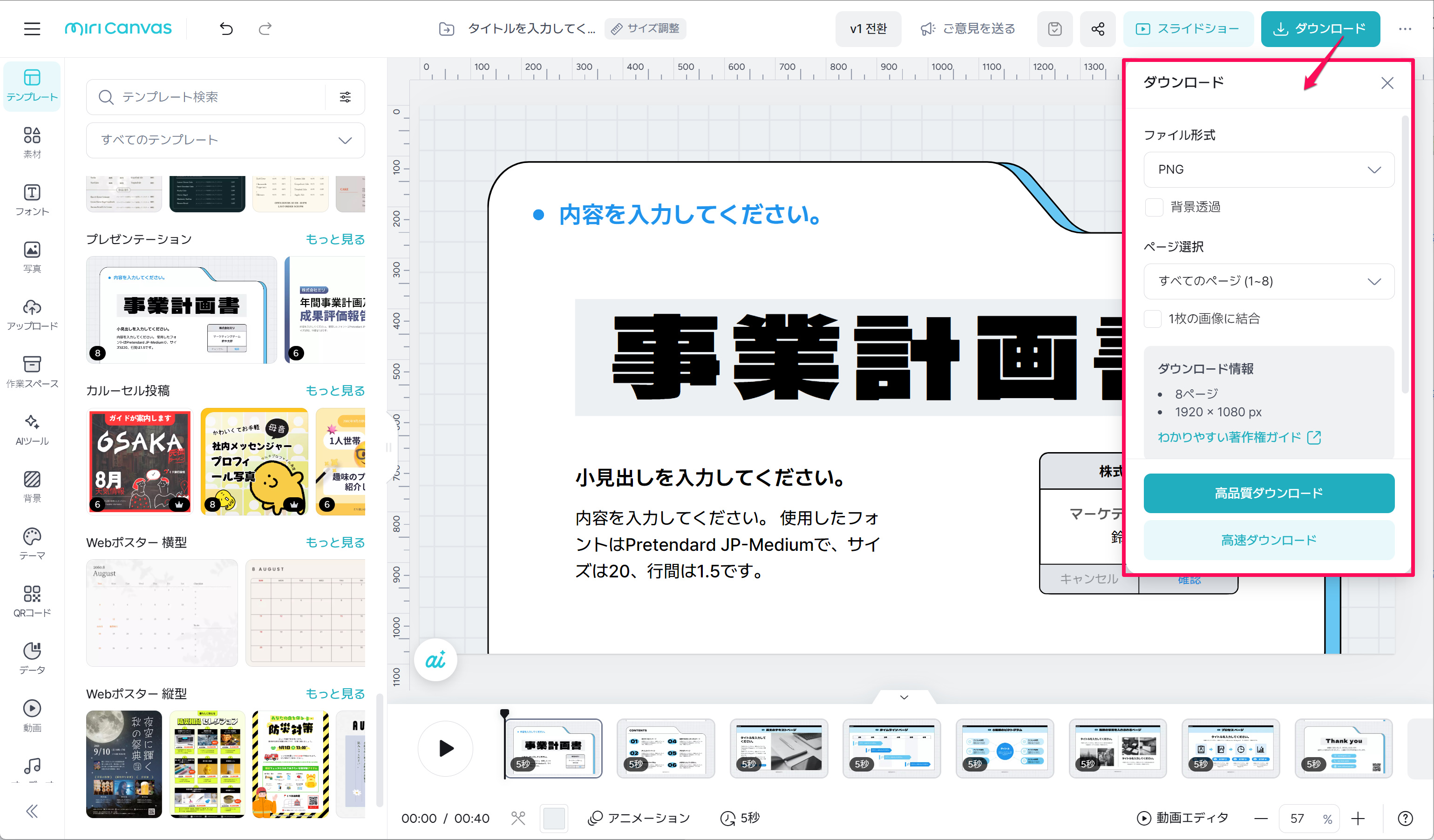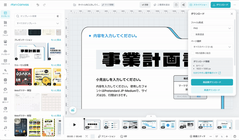 ミリキャンバスで作成した「デザイン」は、お好みのファイル形式でダウンロードいただけます!