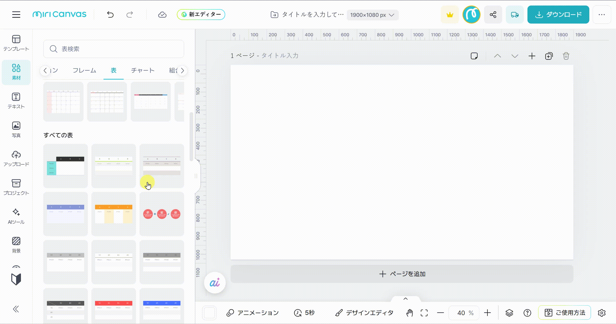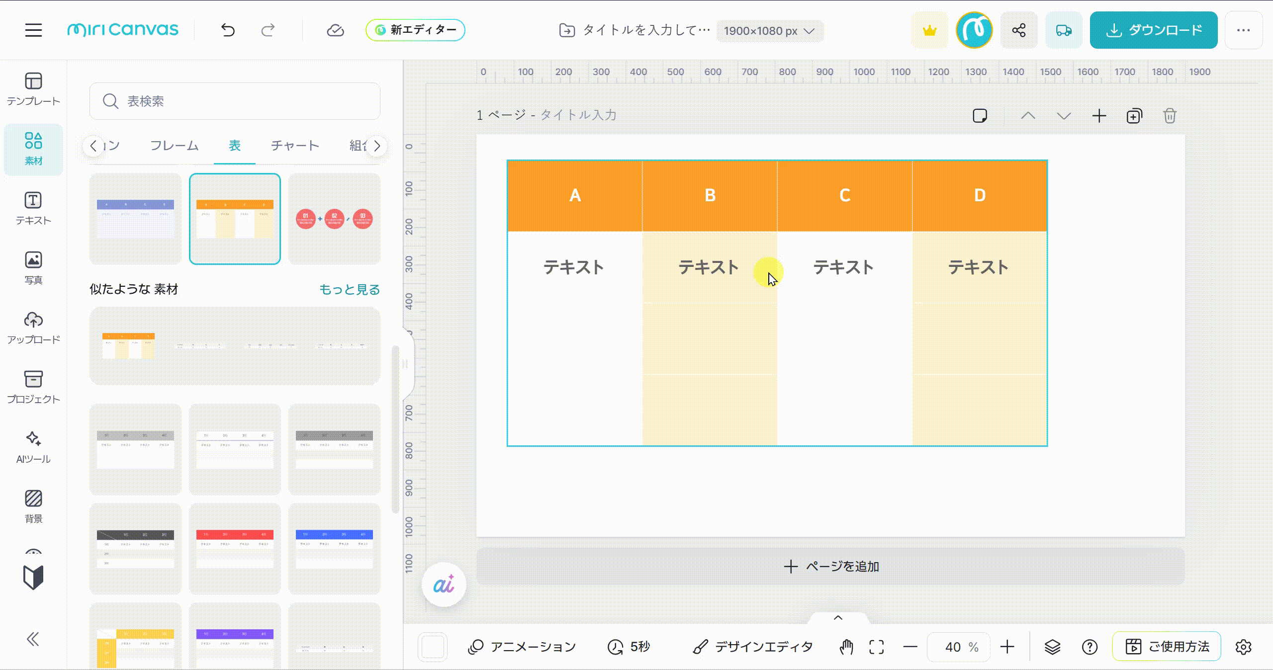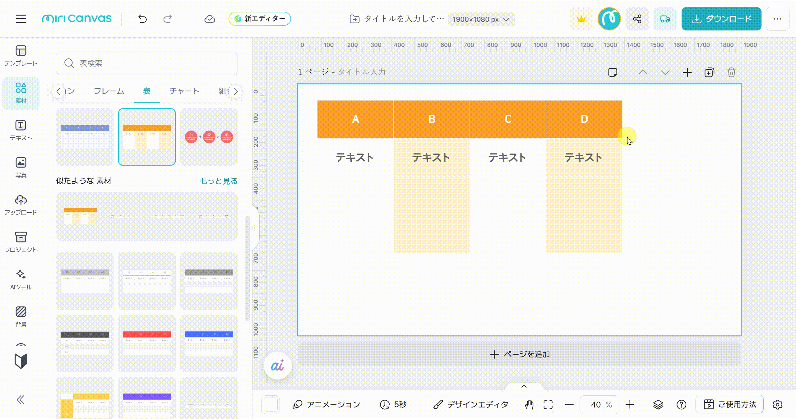 お好きな種類の表を選びクリックすると、右側の編集画面に追加されます。