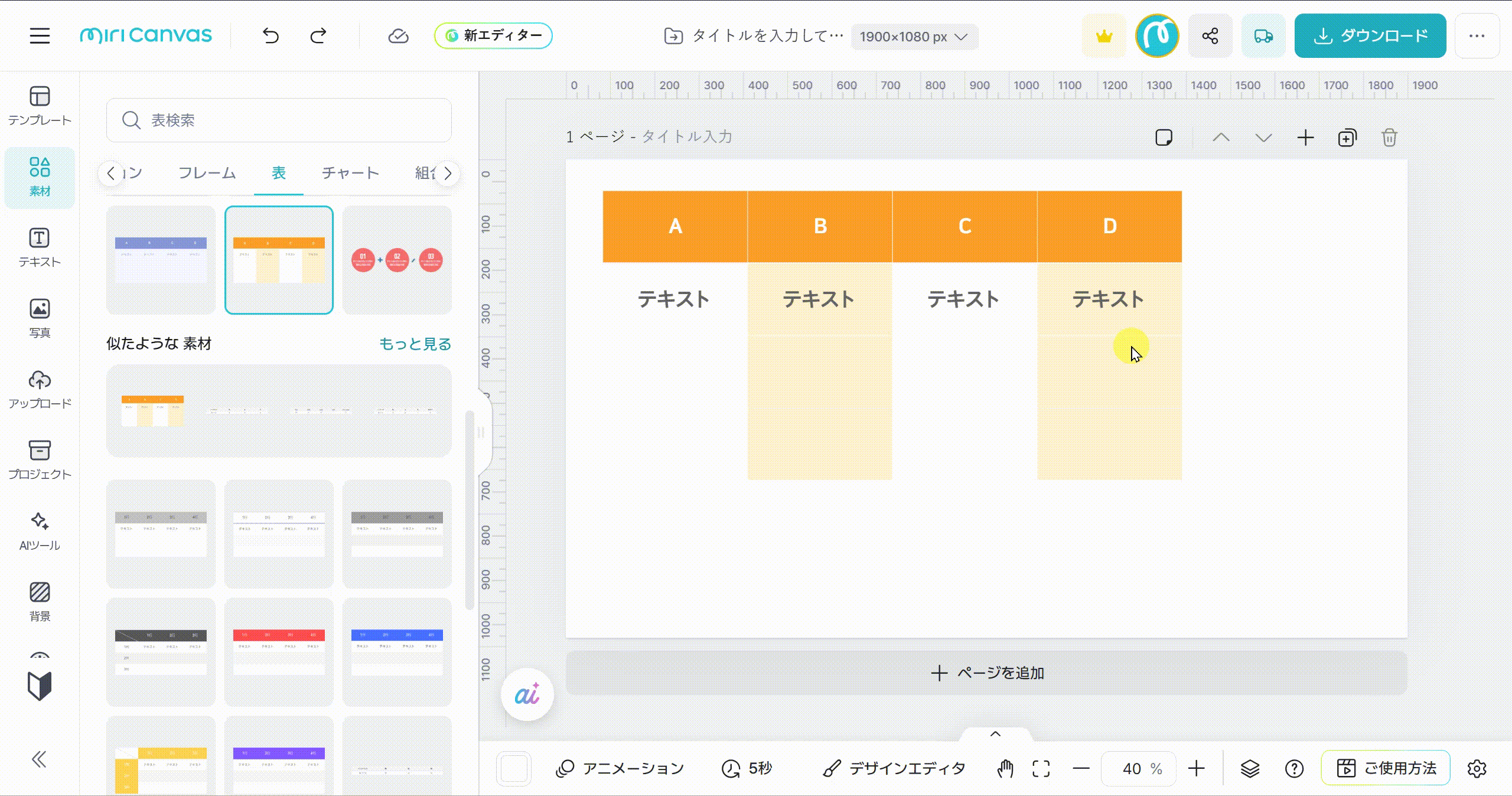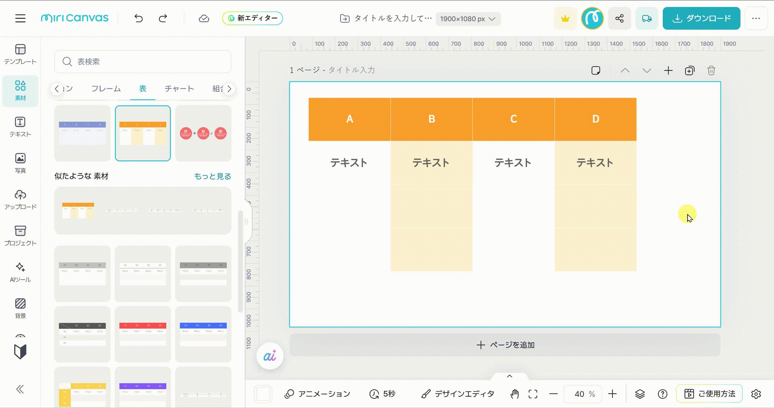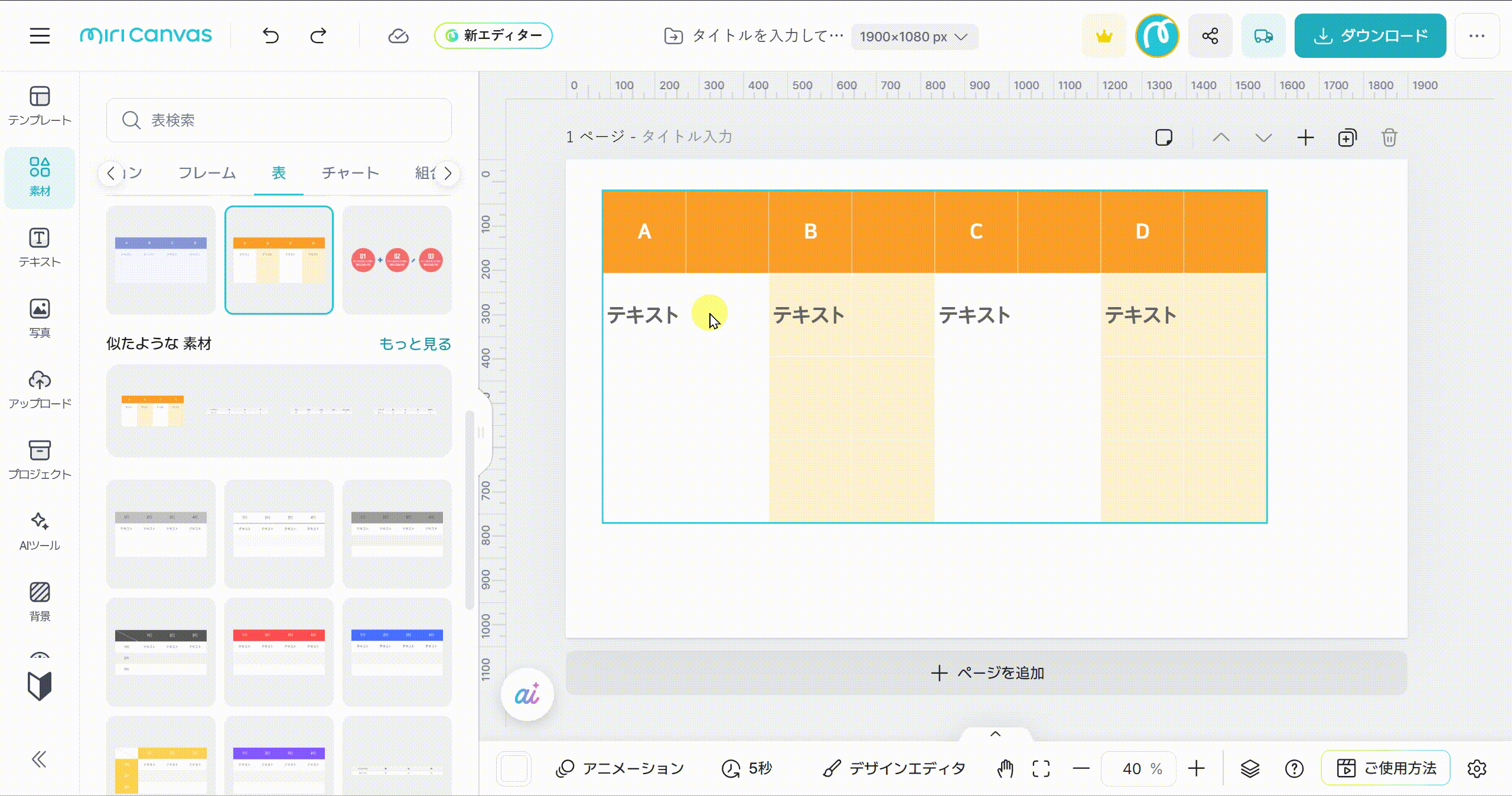 お好きな種類の表を選びクリックすると、右側の編集画面に追加されます。