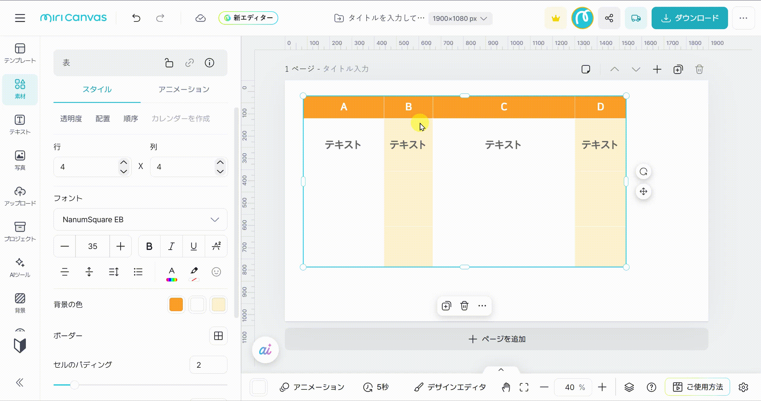 編集画面で表を選択すると、左側の設定パネルで行数と列数を設定できます。