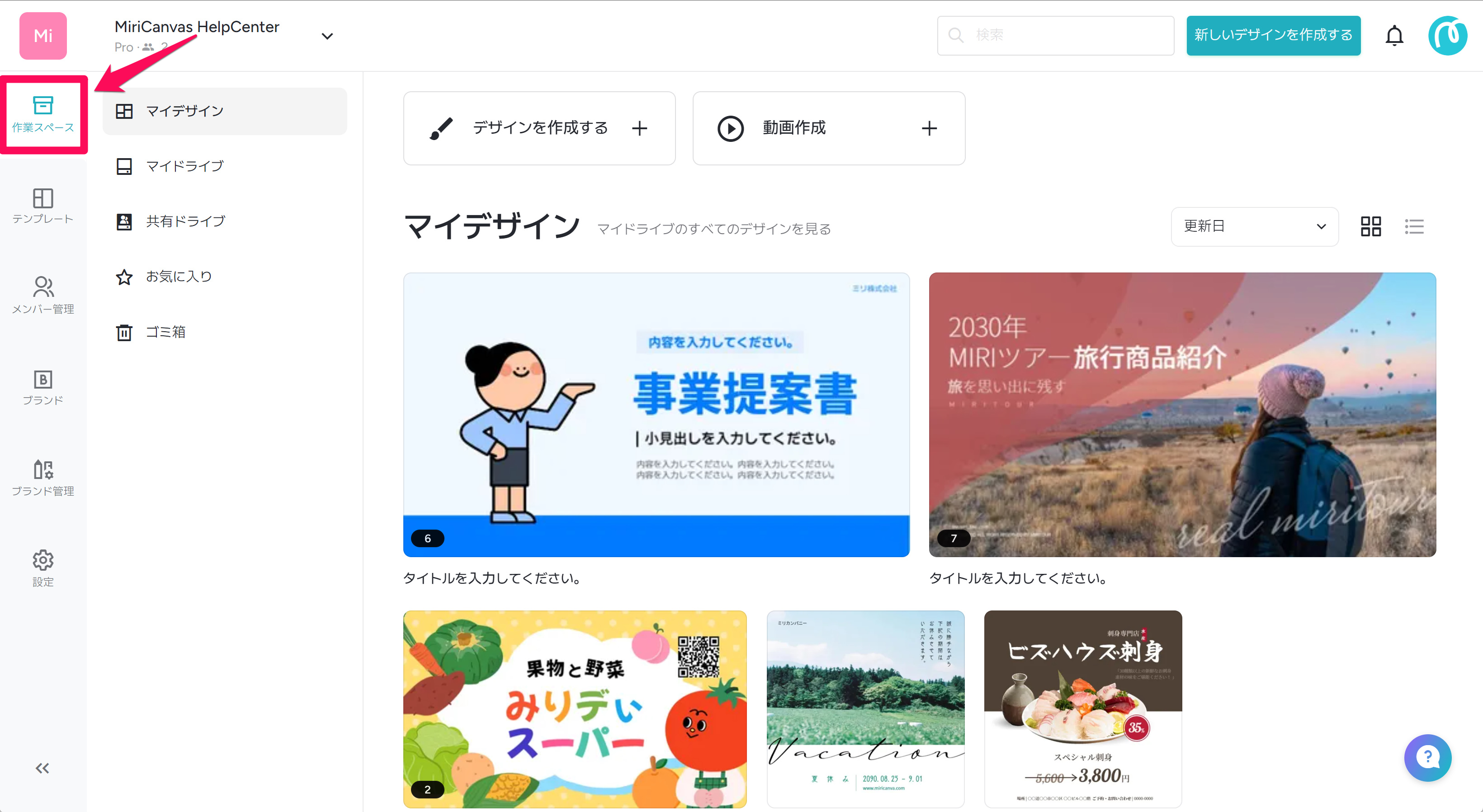 エディターを実行した際に表示される左側のメニューから「作業スペース」メニューをご確認いただけます!