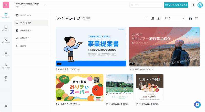[マイデザイン] または [マイドライブ] リストでデザイン文書をクリックすると、現在作業中のページに上書きされます。
