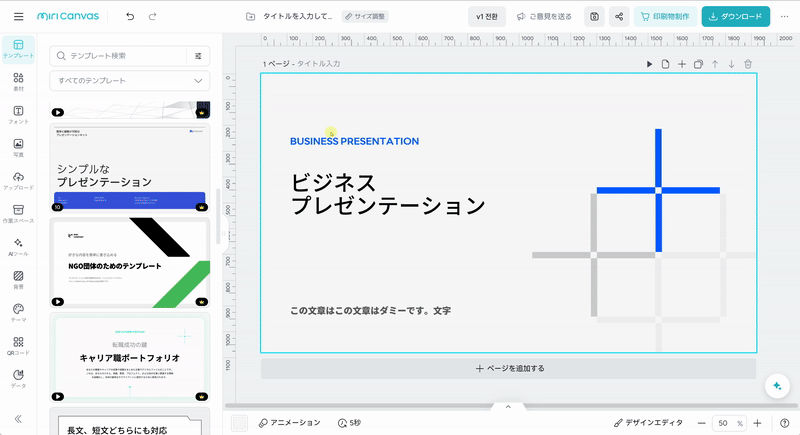 2. テキストメニューからブランドキットを選択すると、タイトル/サブタイトル/本文テキストで指定したフォントのままテキストを追加できます。