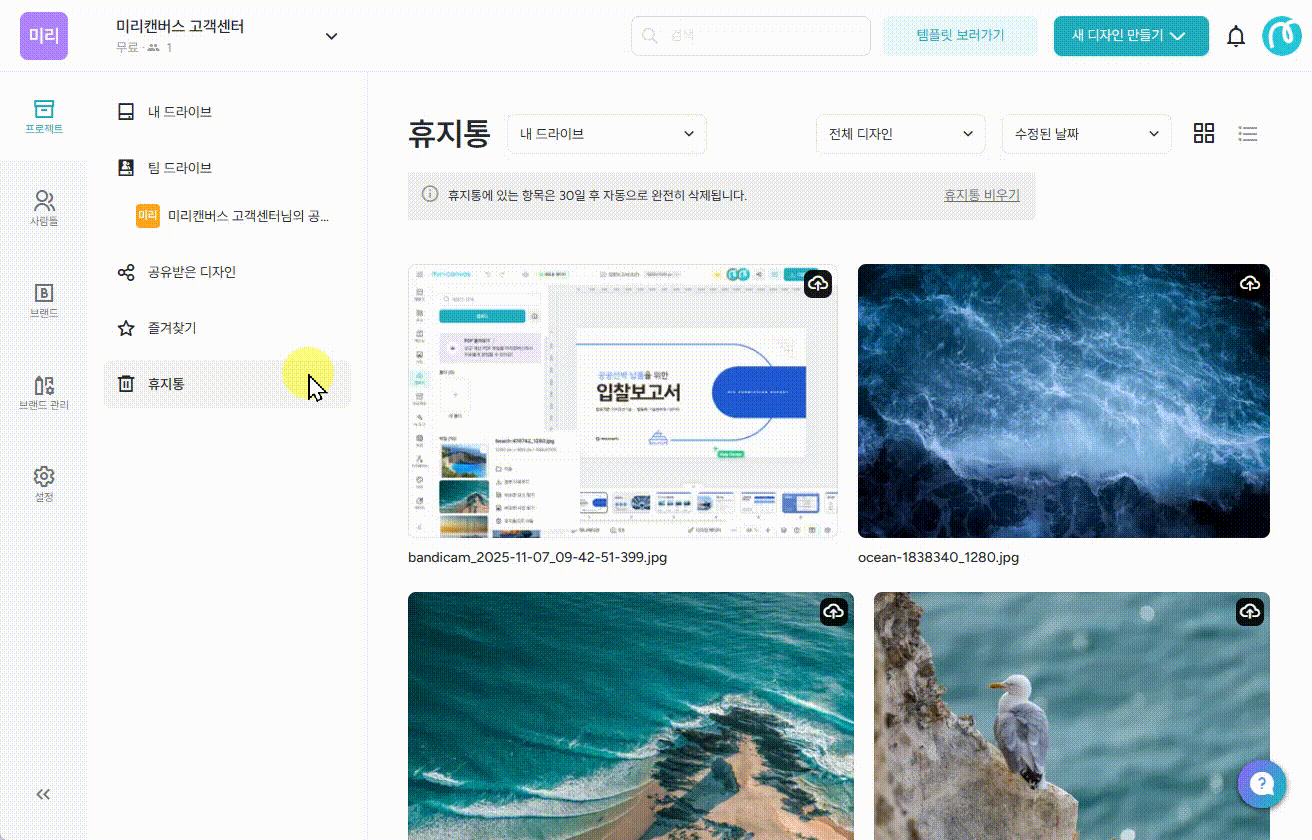 휴지통은 워크스페이스에서만 확인할 수 있는 메뉴예요.