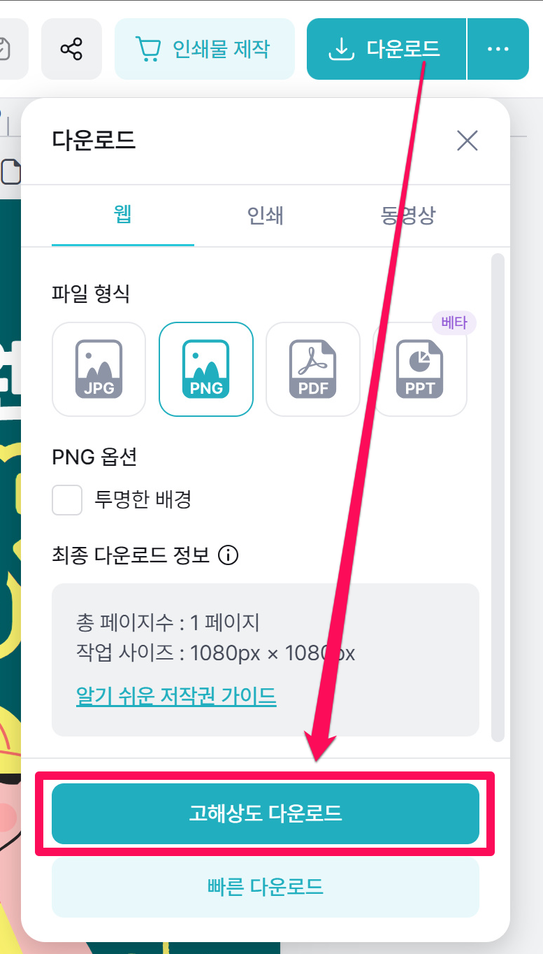 *️⃣ 고해상도 다운로드는 [JPG, PNG, PDF] 총 3가지 파일 형식으로 다운로드가 가능합니다.