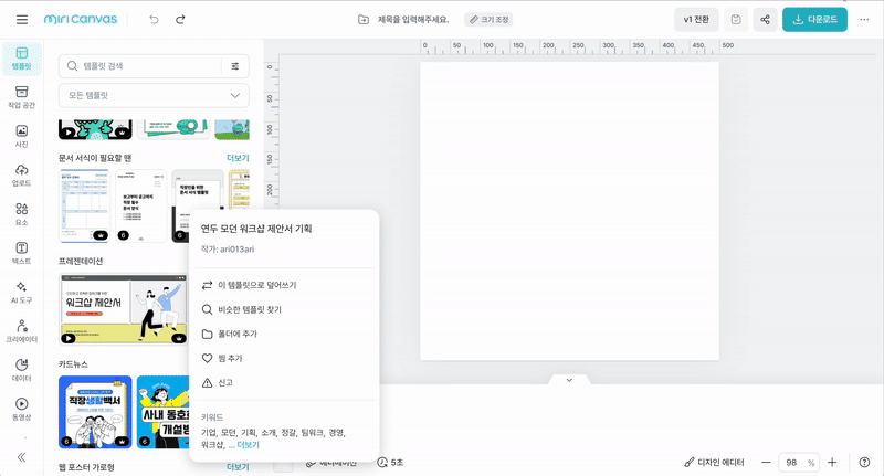 더보기(···) 버튼을 클릭하면 템플릿의 제목과 키워드를 확인할 수 있고, 다른 기능(찜 추가, 폴더에 추가 등)도 이용할 수 있어요.