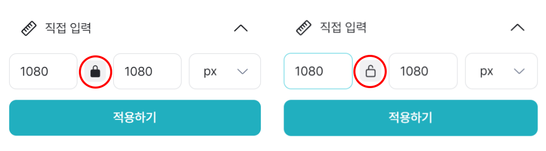 - 자물쇠의 색이 칠해져있다면?(ON) 가로 또는 세로 사이즈를 변경하면 현재 디자인 사이즈의 고정 비율에 맞춰 변경돼요.