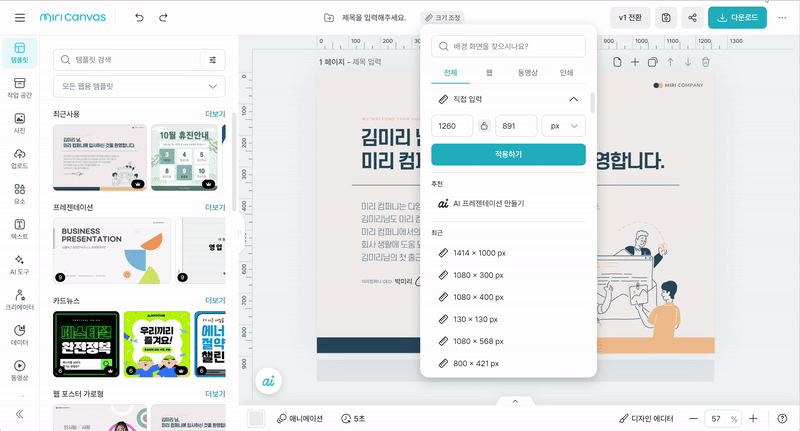 디자인 문서의 사이즈를 변경할 때, 페이지 비율을 그대로 자동 환산해주는 기능이 있어요.