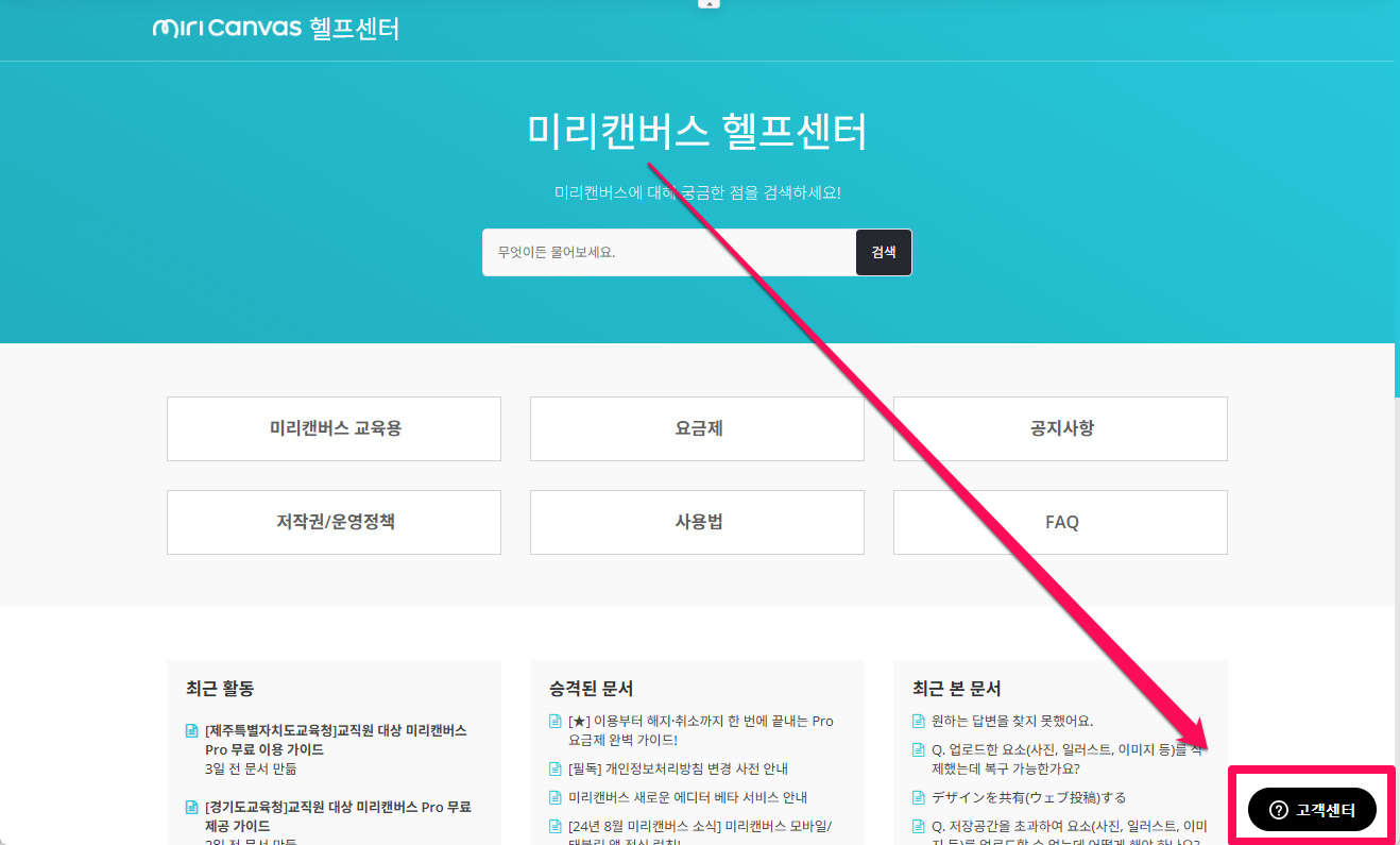 1️⃣오른쪽 하단의 [고객센터] 버튼을 클릭하고 문의 남기기