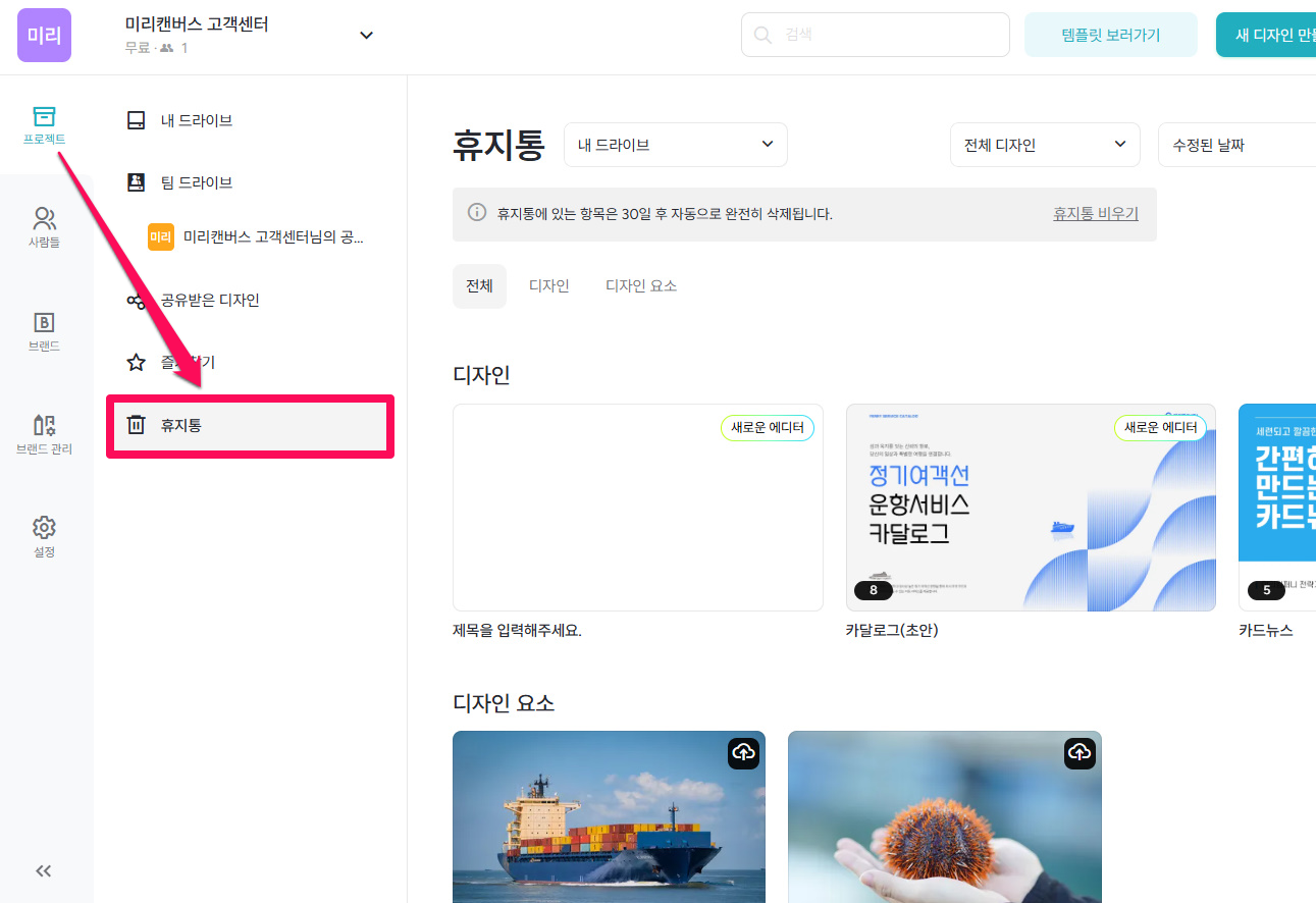 워크스페이스로 이동한 뒤, 휴지통 메뉴를 확인해 주세요.