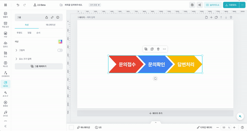 1. 에디터에서 요소와 텍스트를 이용하여 조합 요소를 만들어서 그룹으로 설정해주세요.