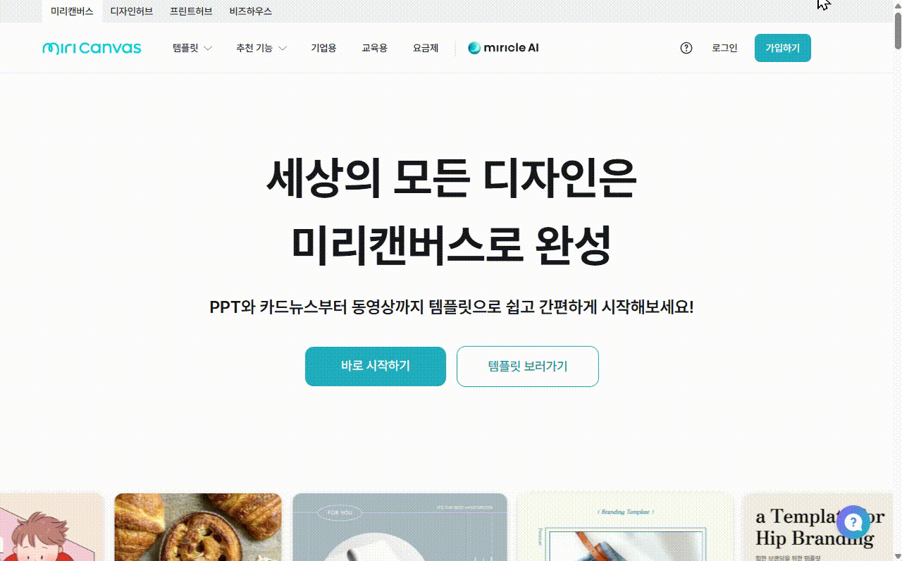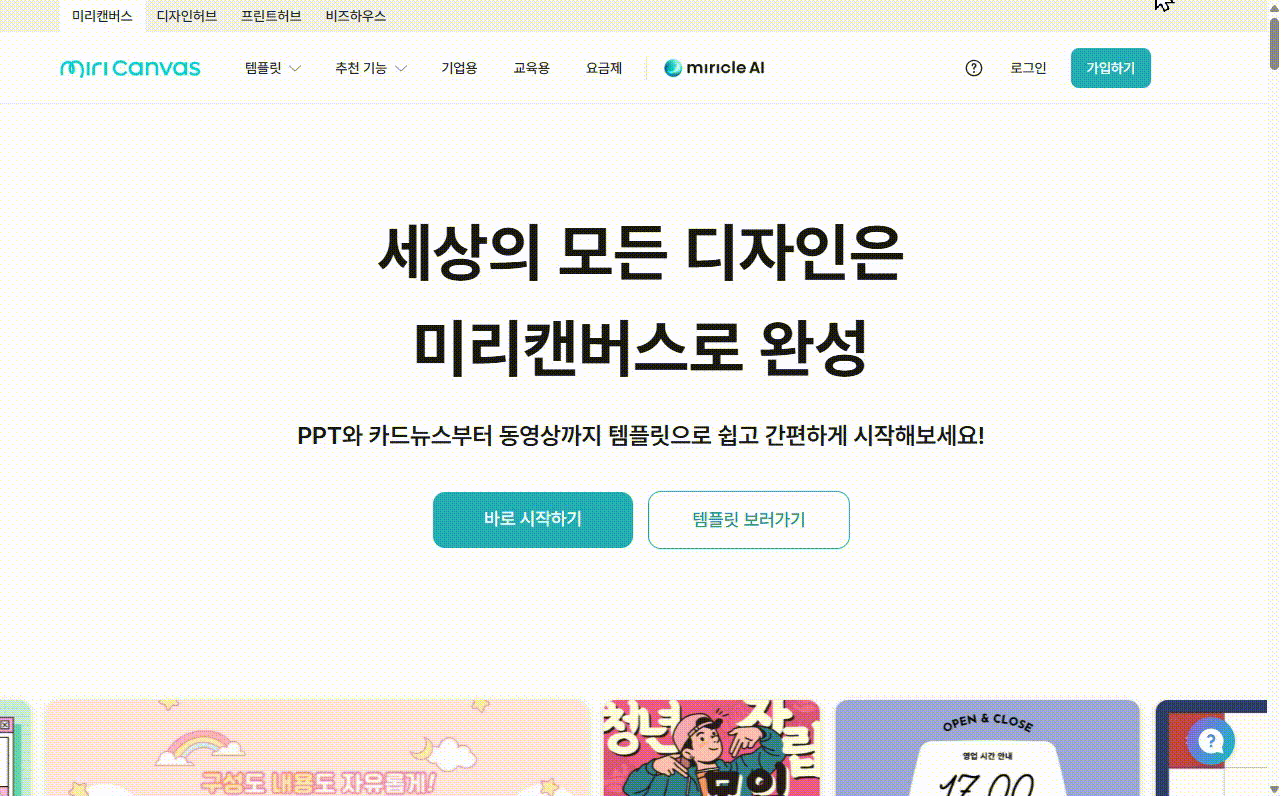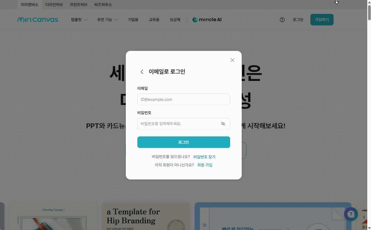 ①미리캔버스 홈페이지에서 오른쪽 상단의 [로그인 → 이메일 로그인] 순서로 진행해 주세요.