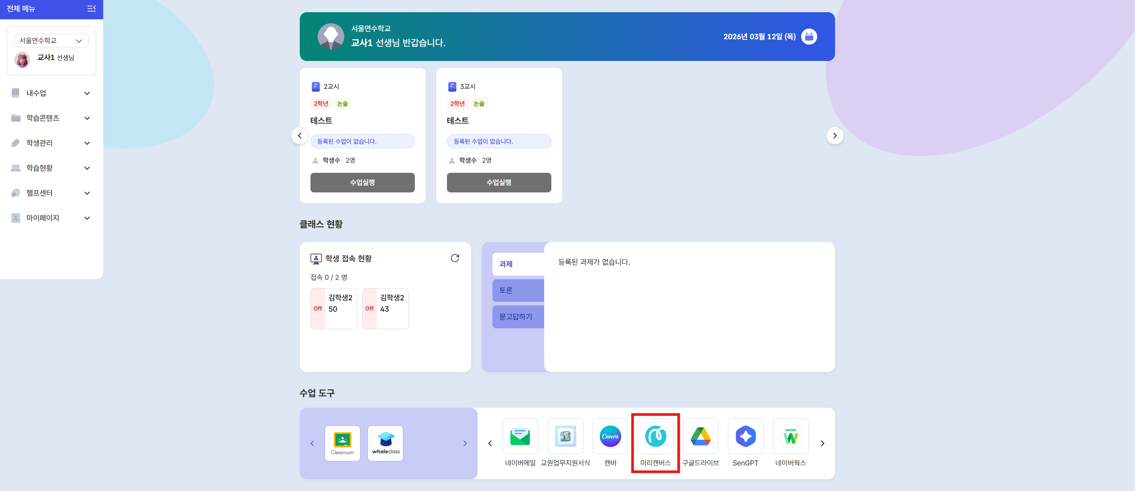 2. 하단의 [수업도구]에서 '미리캔버스'를 선택해주세요.