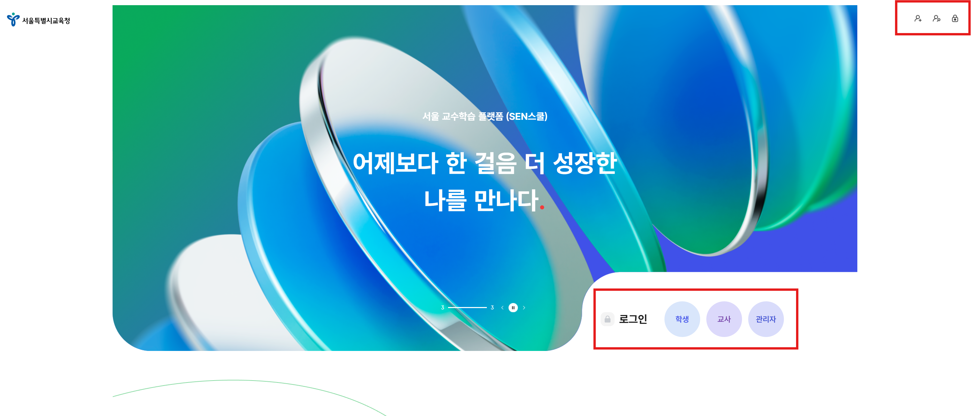 1. 서울교육청 SEN 스쿨에 접속해 상단 오른쪽에 있는 로그인 해주세요.