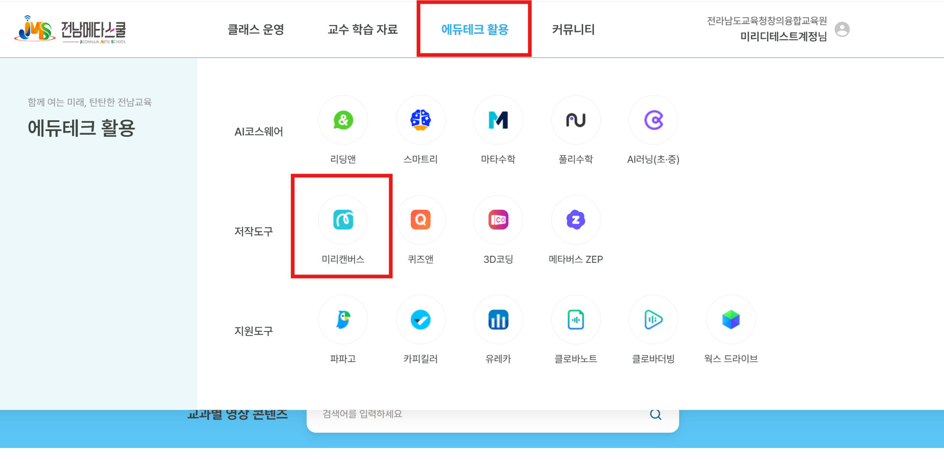 1-1. 상단의 [에듀테크 활용] 탭의 '저작도구' [미리캔버스]를 클릭해주세요.