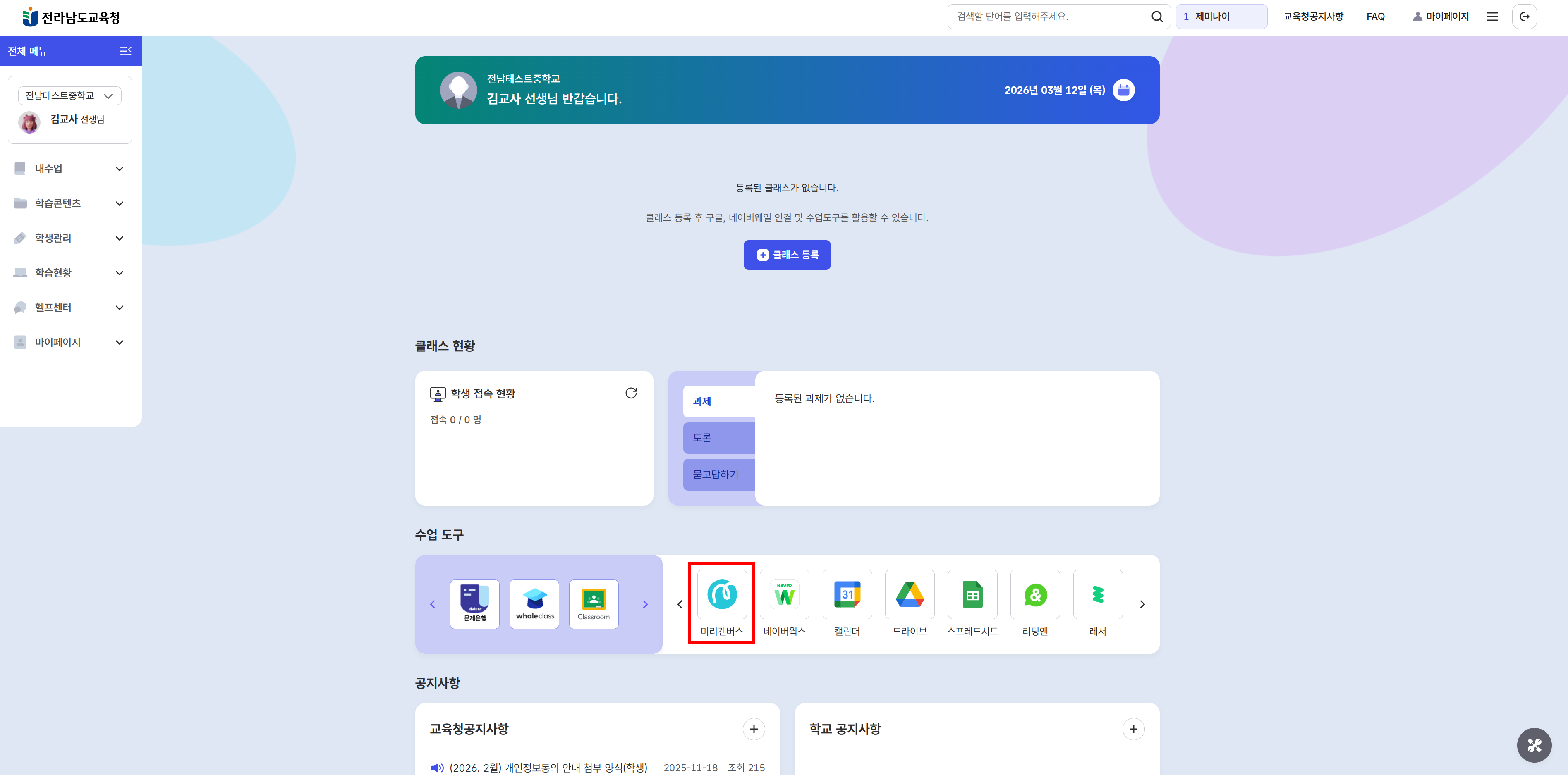2. 하단의 [수업도구]에서 '미리캔버스'를 선택해주세요.