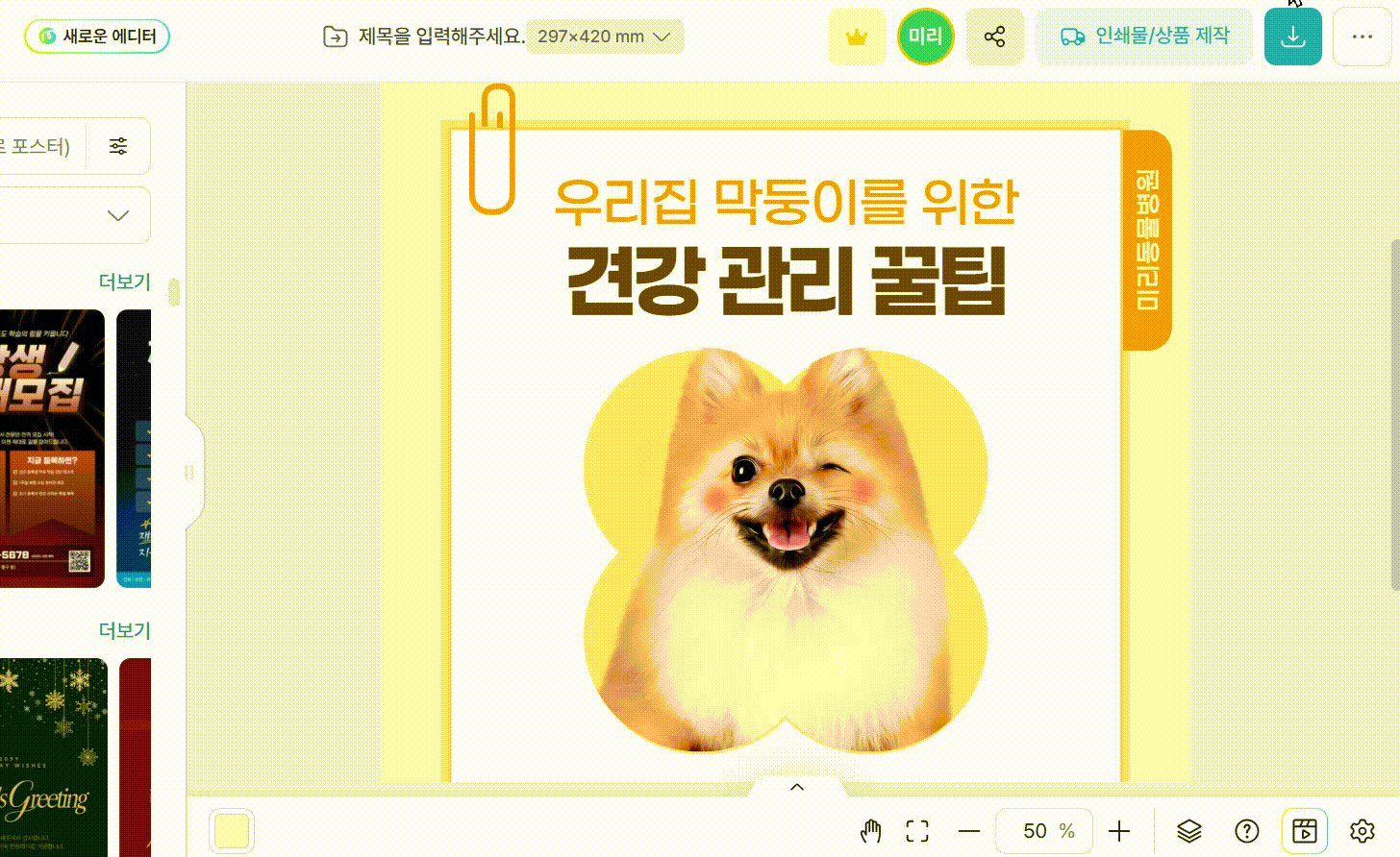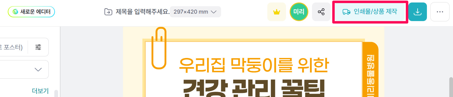 ③인쇄 상품으로 주문할 디자인을 제작한 후, 오른쪽 상단의 '인쇄물/상품 제작'을 클릭해 주세요.