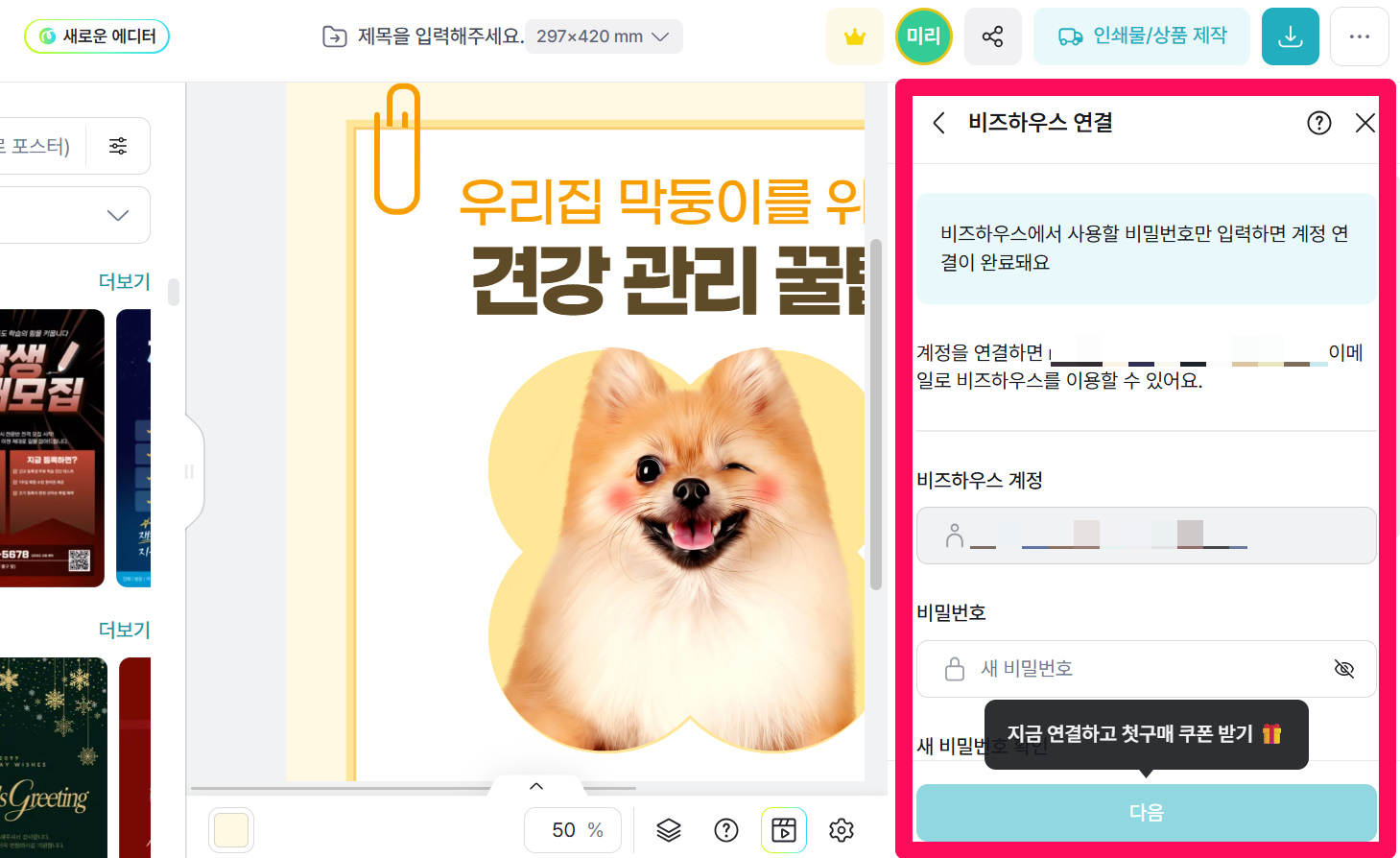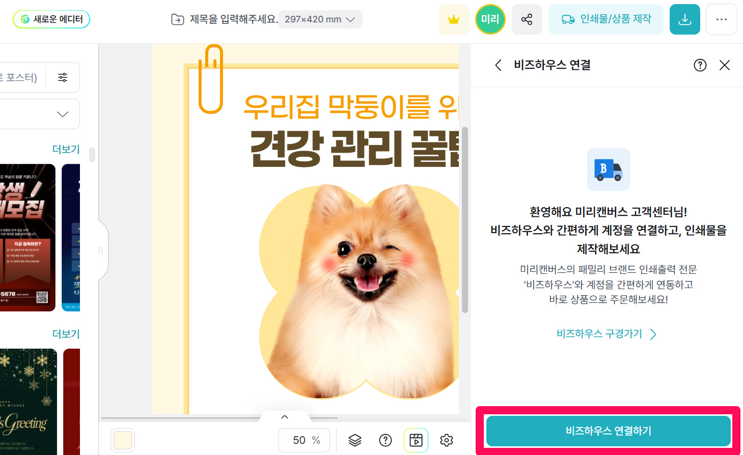 ④이동된 페이지에서 템플릿을 선택한 후 에디터를 실행하시면, 미리캔버스 계정이 자동으로 가입되며 연동이 완료됩니다.
