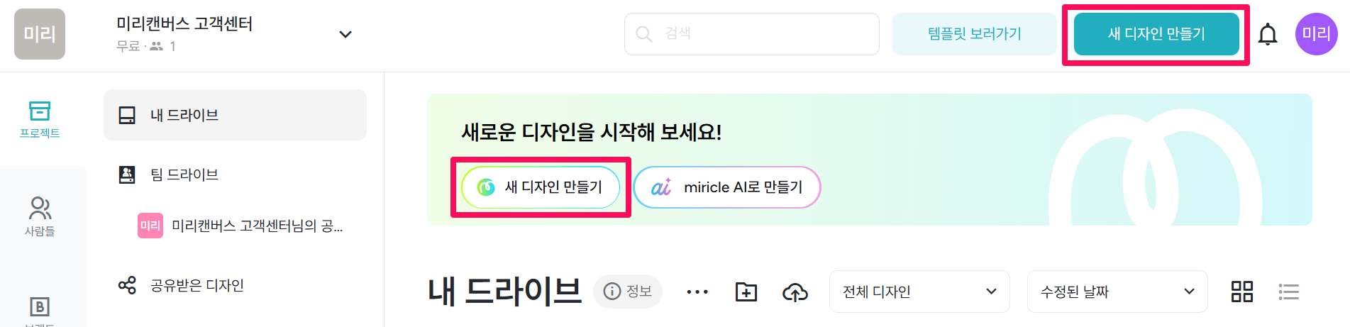 ①미리캔버스 계정으로 로그인 후, 워크스페이스로 이동해 주세요.