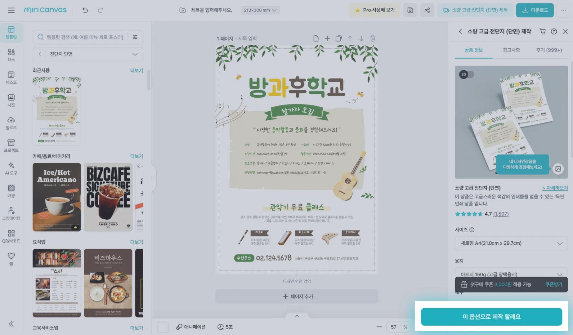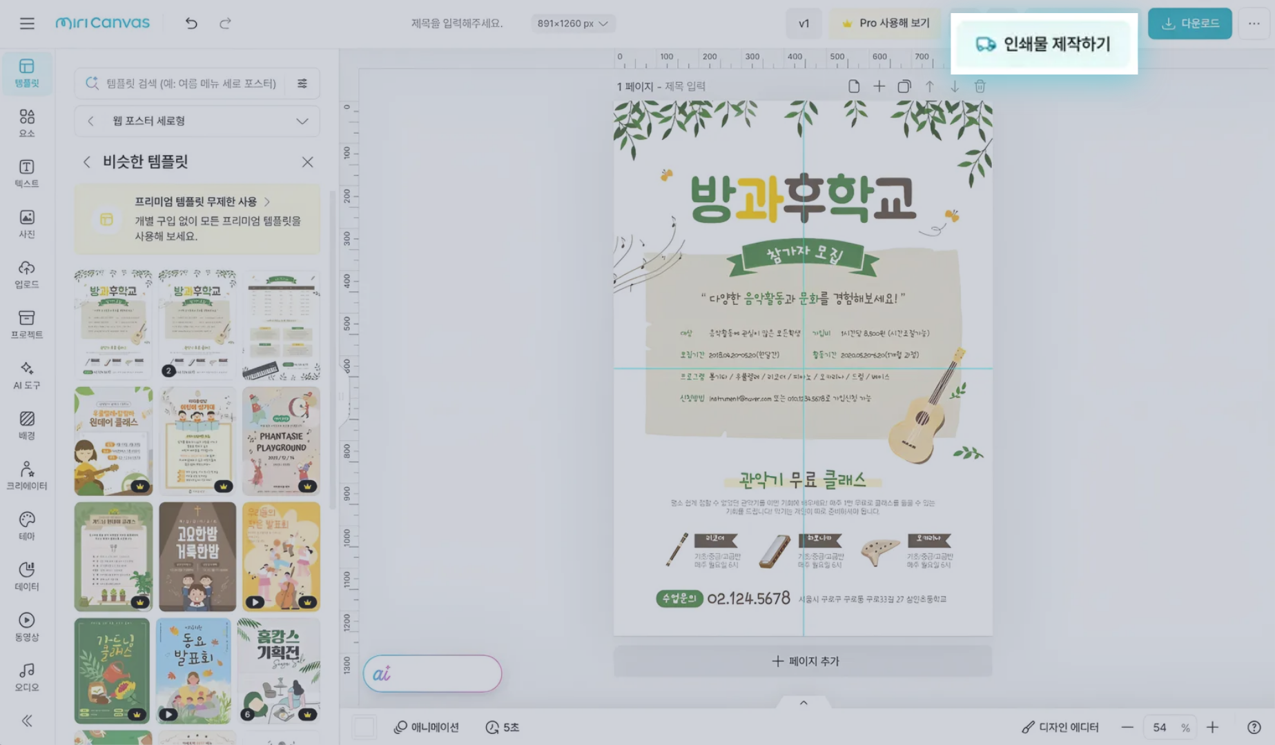 3. 에디터에서 원하시는 디자인을 제작하신 후, 화면 오른쪽 상단의 「인쇄물 제작하기」 버튼을 눌러주세요.