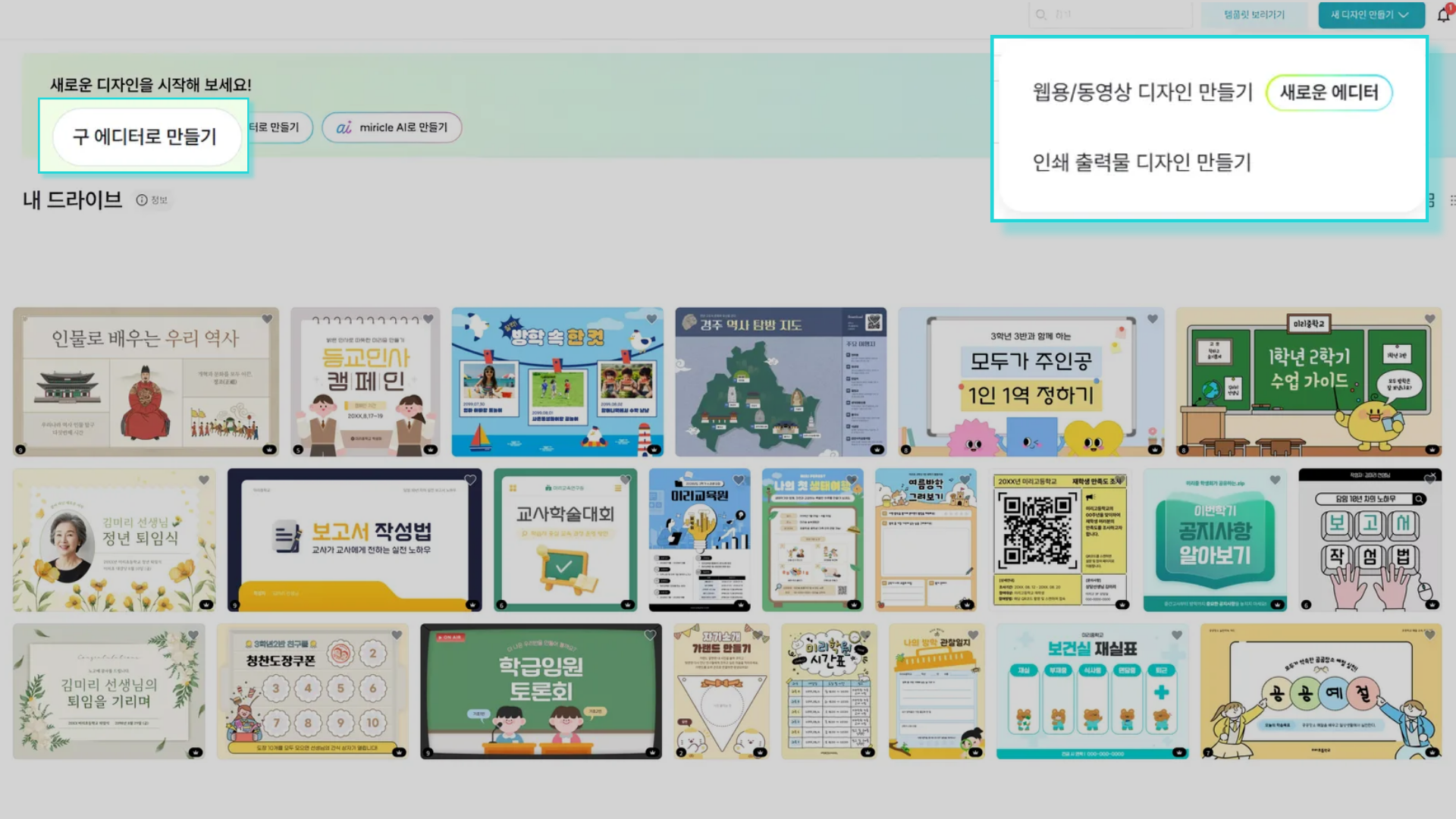 2. 「구 에디터로 만들기」 또는 우측 상단 새디자인 만들기 -「인쇄 출력물 디자인 만들기」 버튼을 눌러주세요.