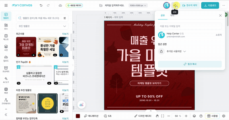 새로워진 공유 기능으로 디자인 문서를 함께 확인할 팀 멤버 또는 외부 사용자를 추가해 보세요! 😊
