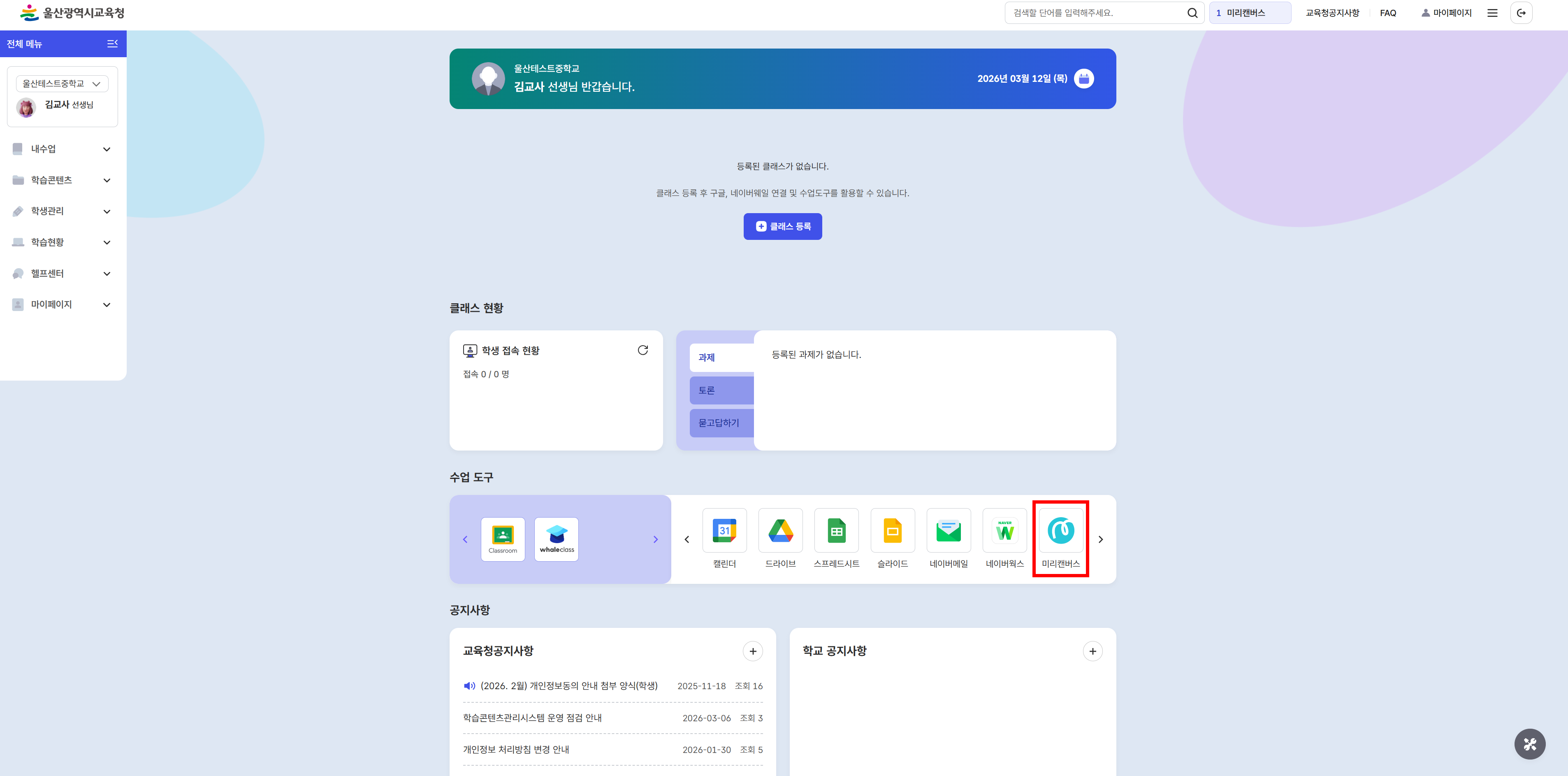 2. 좌측 상단 [울산광역시 교육청] 로고 클릭 후 오른쪽 하단 [수업 도구]에서 '미리캔버스'를 선택해주세요.