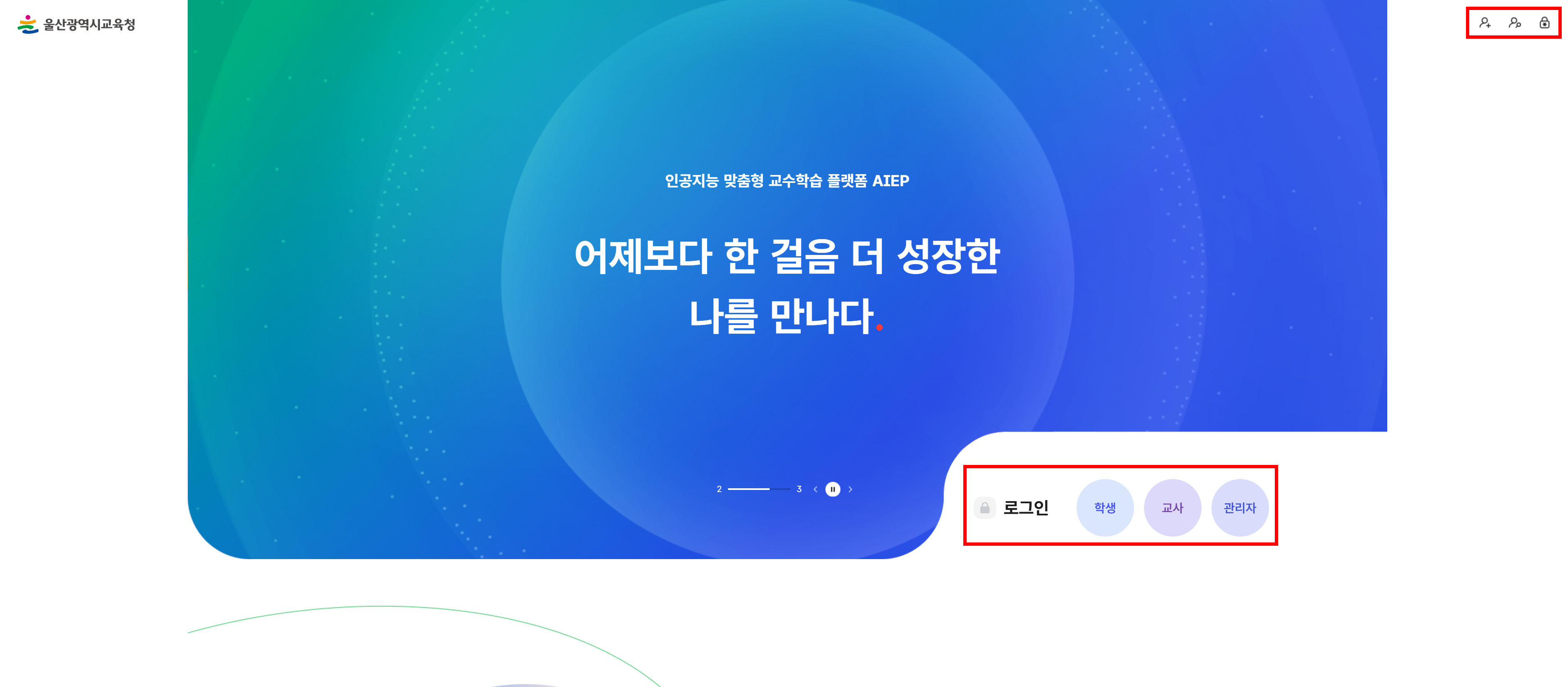 1. 울산광역시 교육청 울산AIEP 에 접속해 중앙에 있는 교사/관리자로 로그인 해주세요.