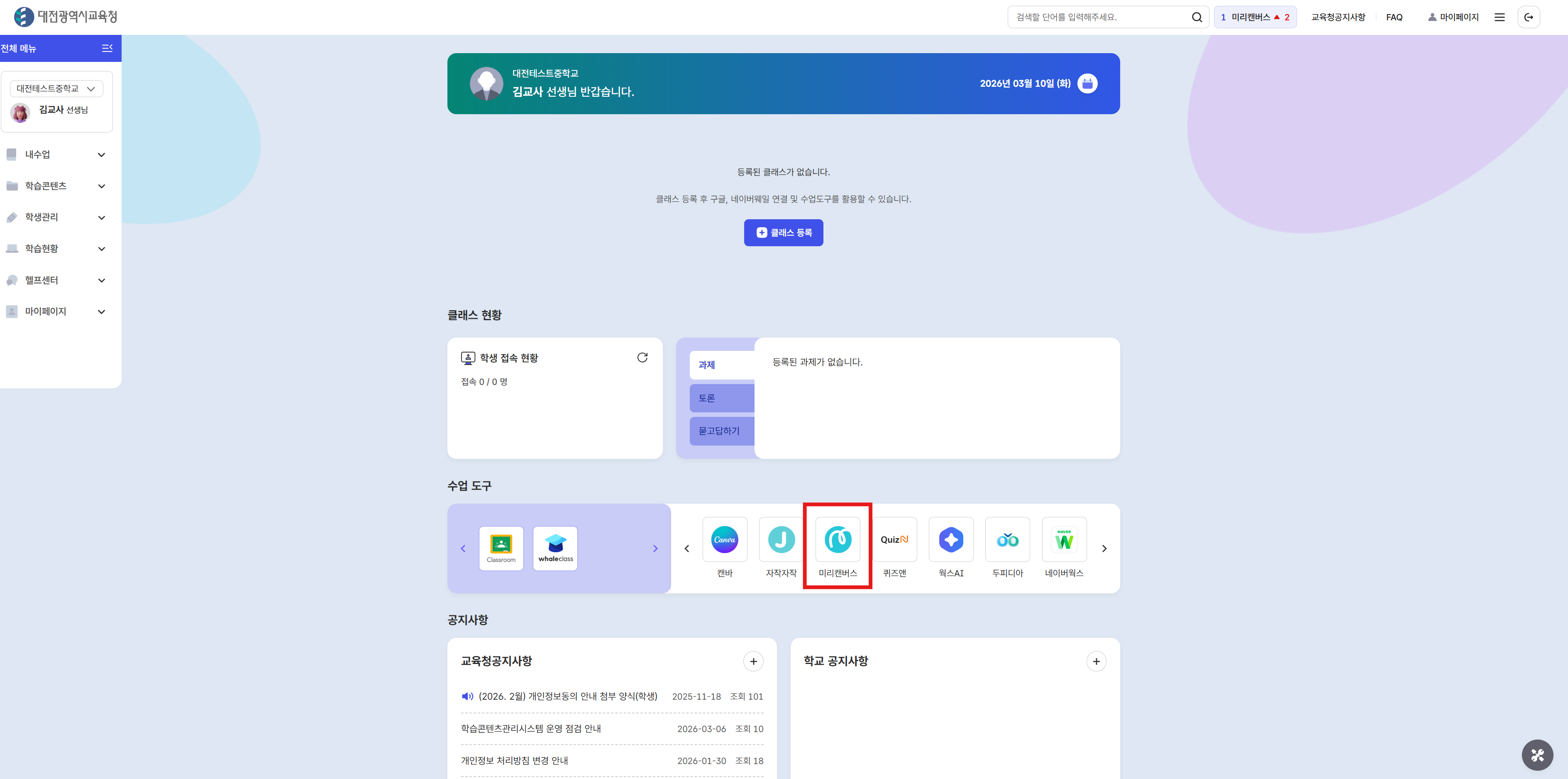 2. 하단의 [수업도구]에서 '미리캔버스'를 선택해주세요.