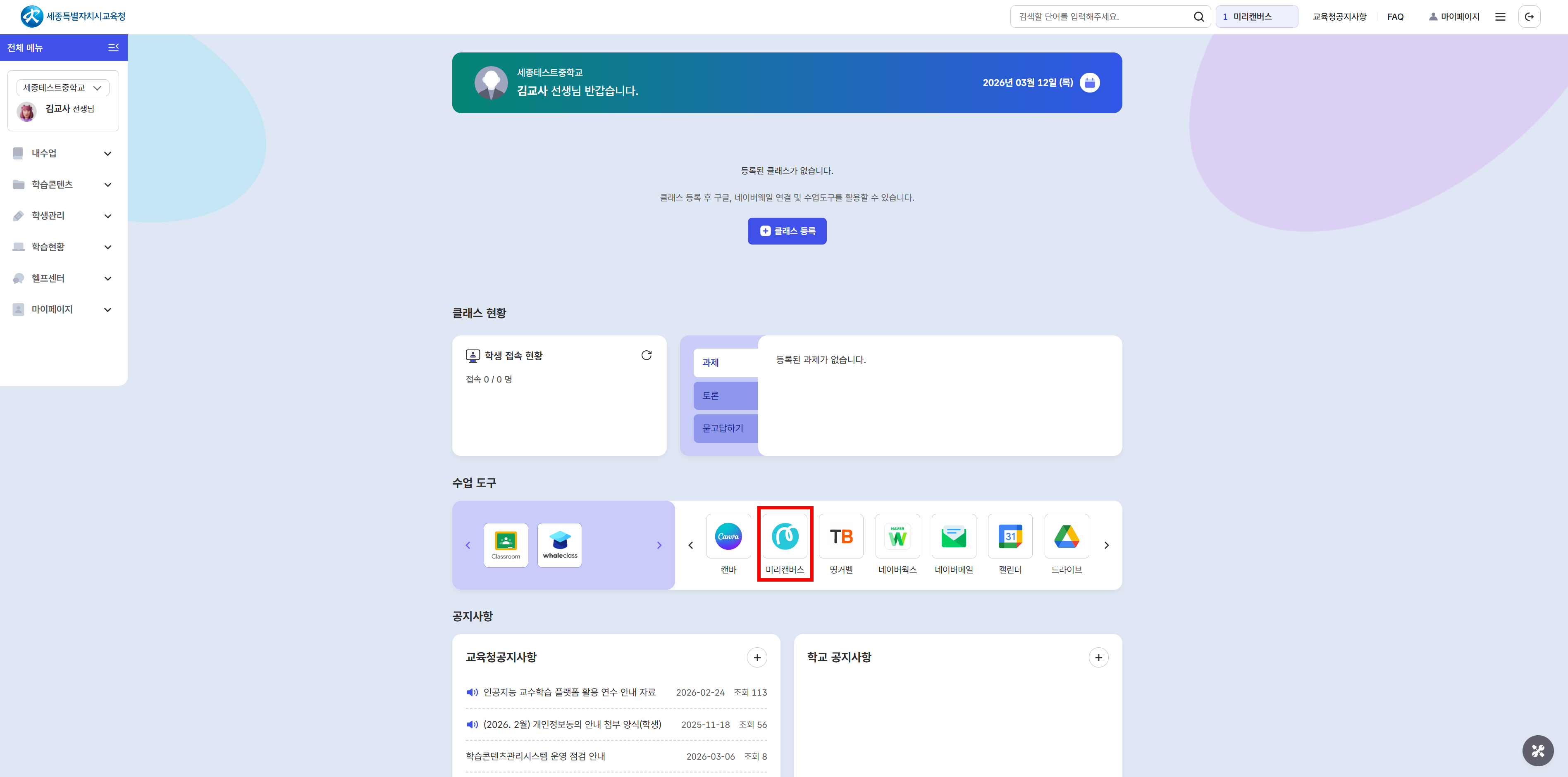 2. 하단의 [수업도구]에서 '미리캔버스'를 선택해주세요.