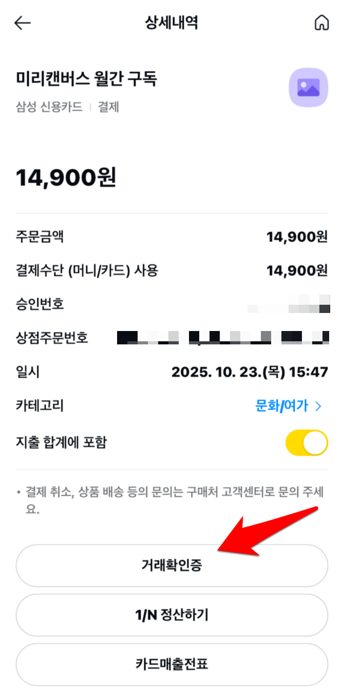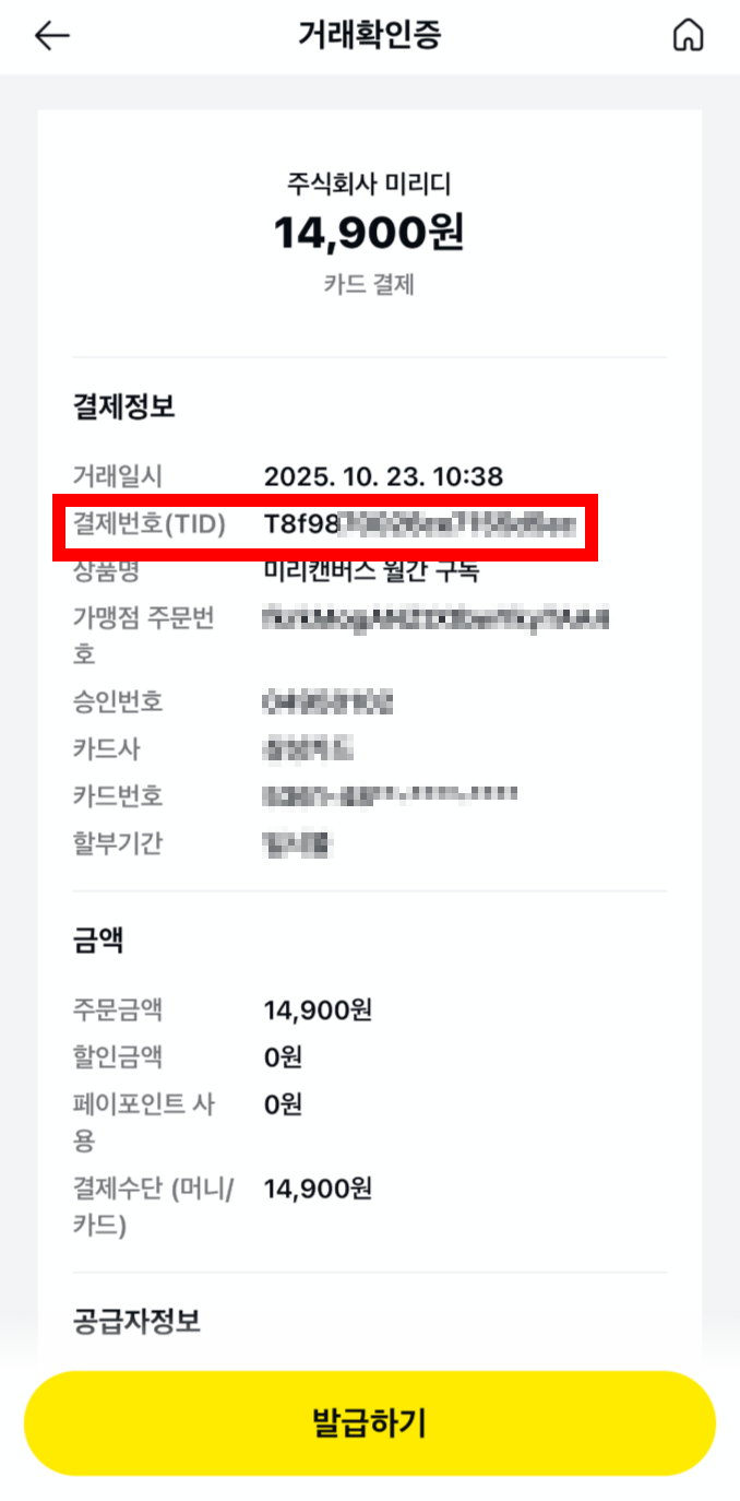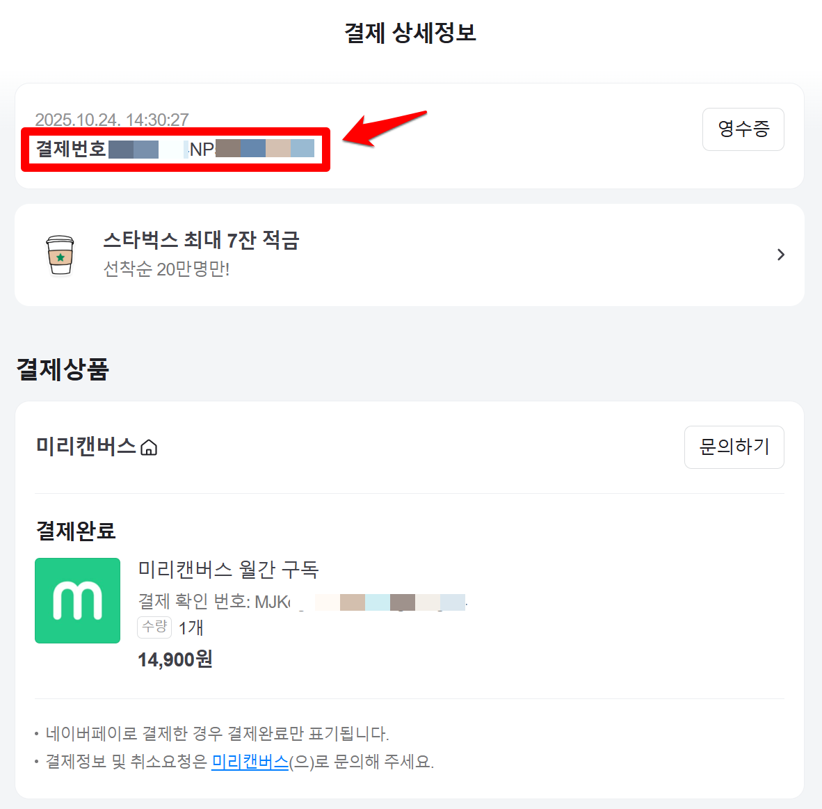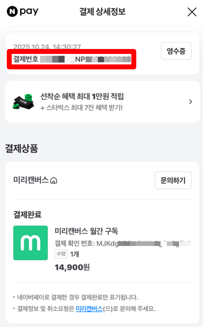 4️⃣거래확인증에서 [결제 번호]가 보이도록 캡처하신 후 미리캔버스 온라인 문의를 통해 문의 내용과 함께 남겨 주세요.