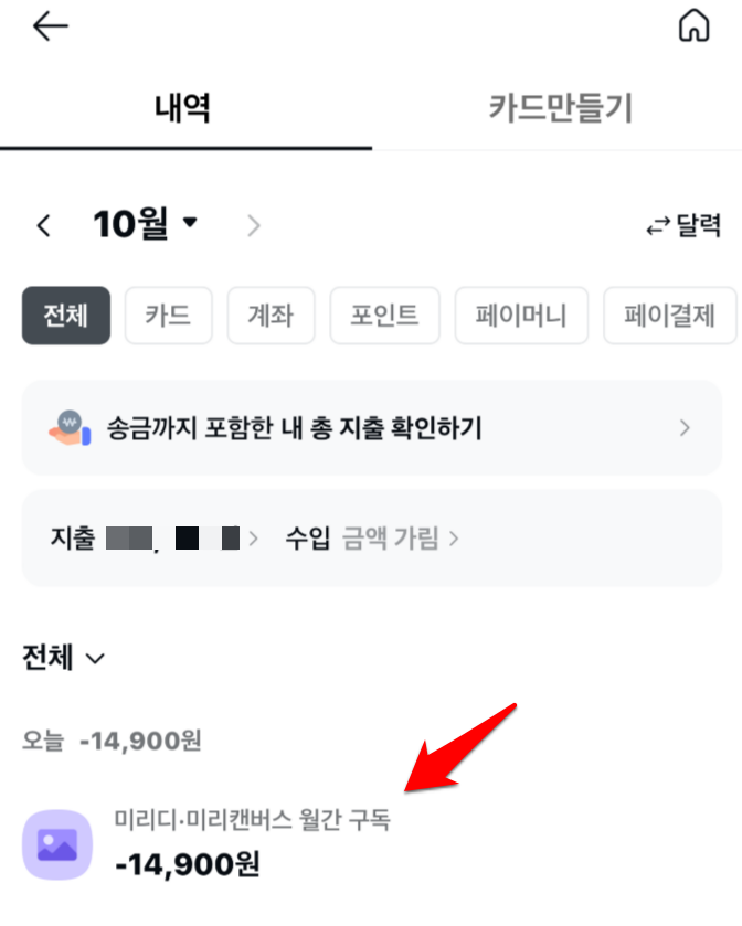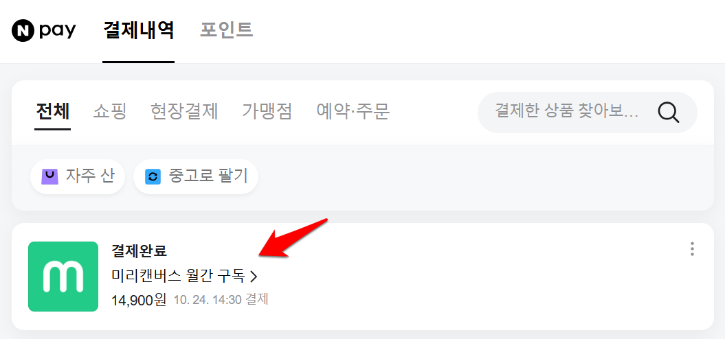 전체 결제 건들 중 미리캔버스 결제 건이 있는지 확인 후 상품명(미리캔버스 월간or연간 구독)을 클릭해 주세요.