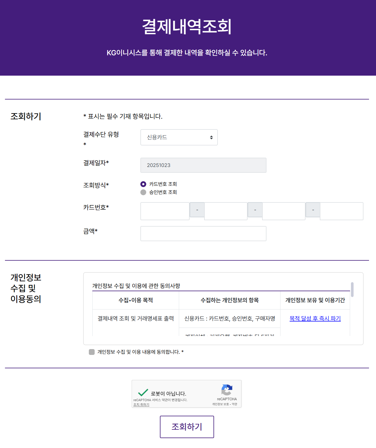 4️⃣조회 방식을 '카드번호 조회'로 선택하고, 정보 입력 및 개인정보 수집 및 이용 내용에 동의 후 [조회하기]를 클릭해 주세요.