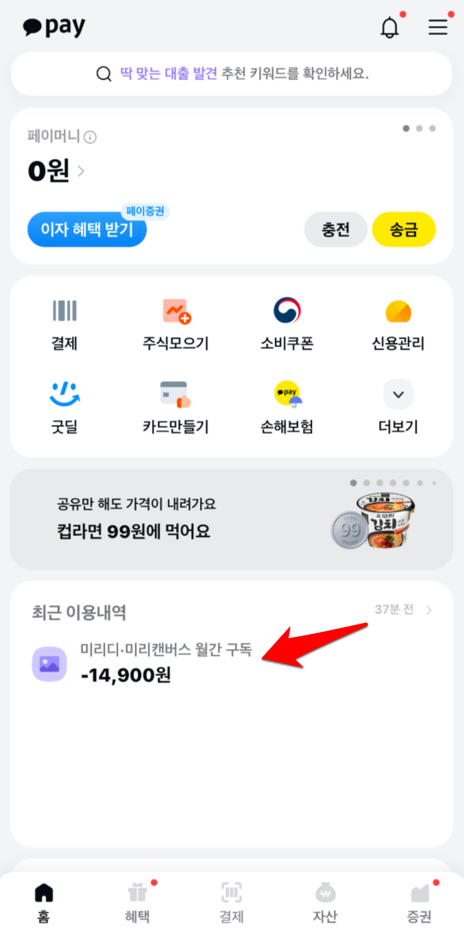 1️⃣"카카오페이 앱"으로 접속해 주신 다음 메인 화면의 [최근 이용 내역]에서 미리캔버스 결제 건을 클릭해 주세요. (카카오페이는 모바일을 통해 확인해 주셔야 합니다.)