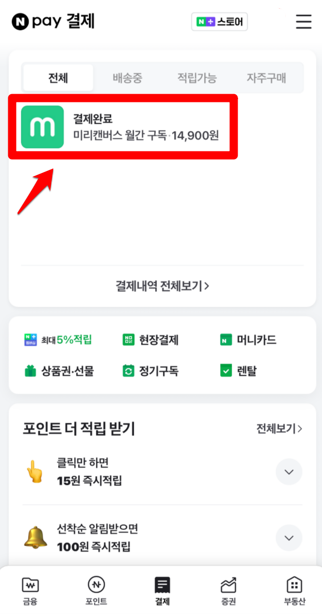 2️⃣ 하단의 메뉴들 중 [결제] 버튼을 클릭해 주세요.