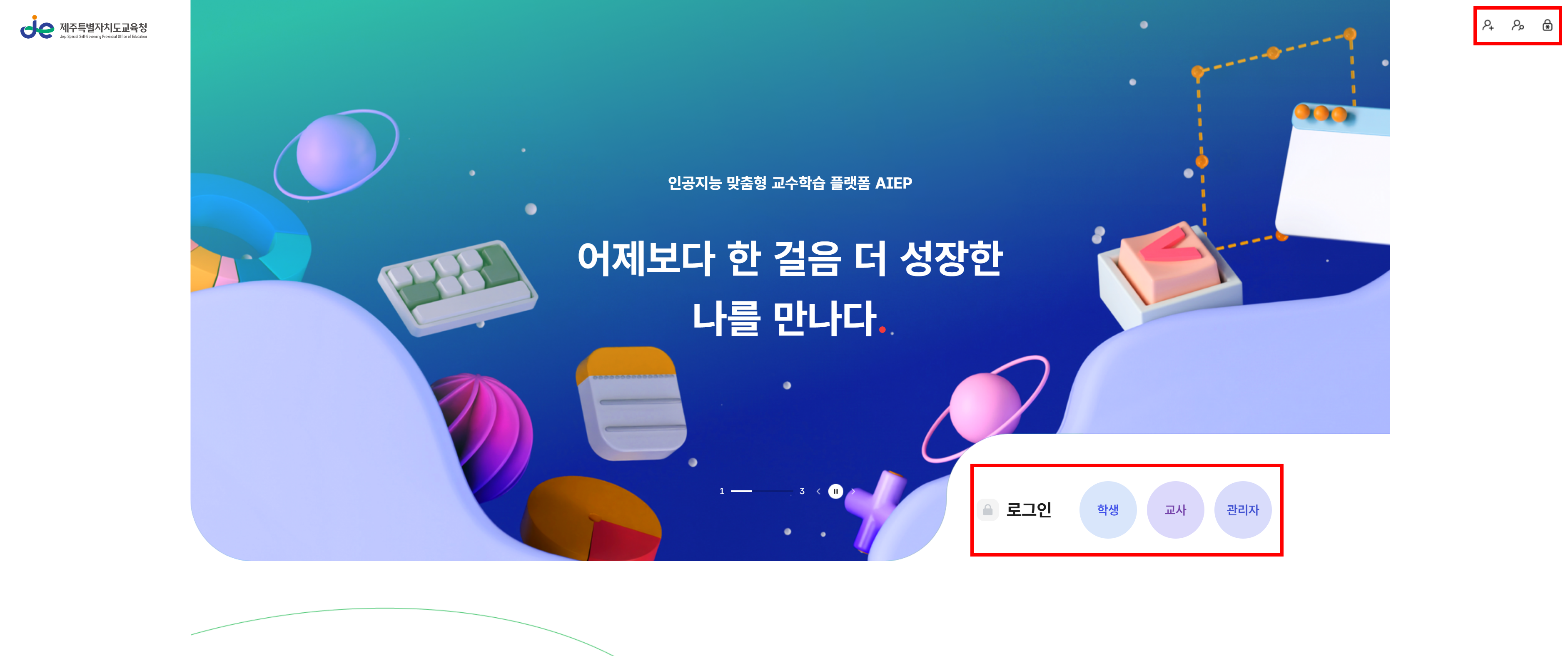 1. 제주특별자치도 교육청 제주 AIEP에 접속해 상단 오른쪽에 있는 로그인 해주세요.