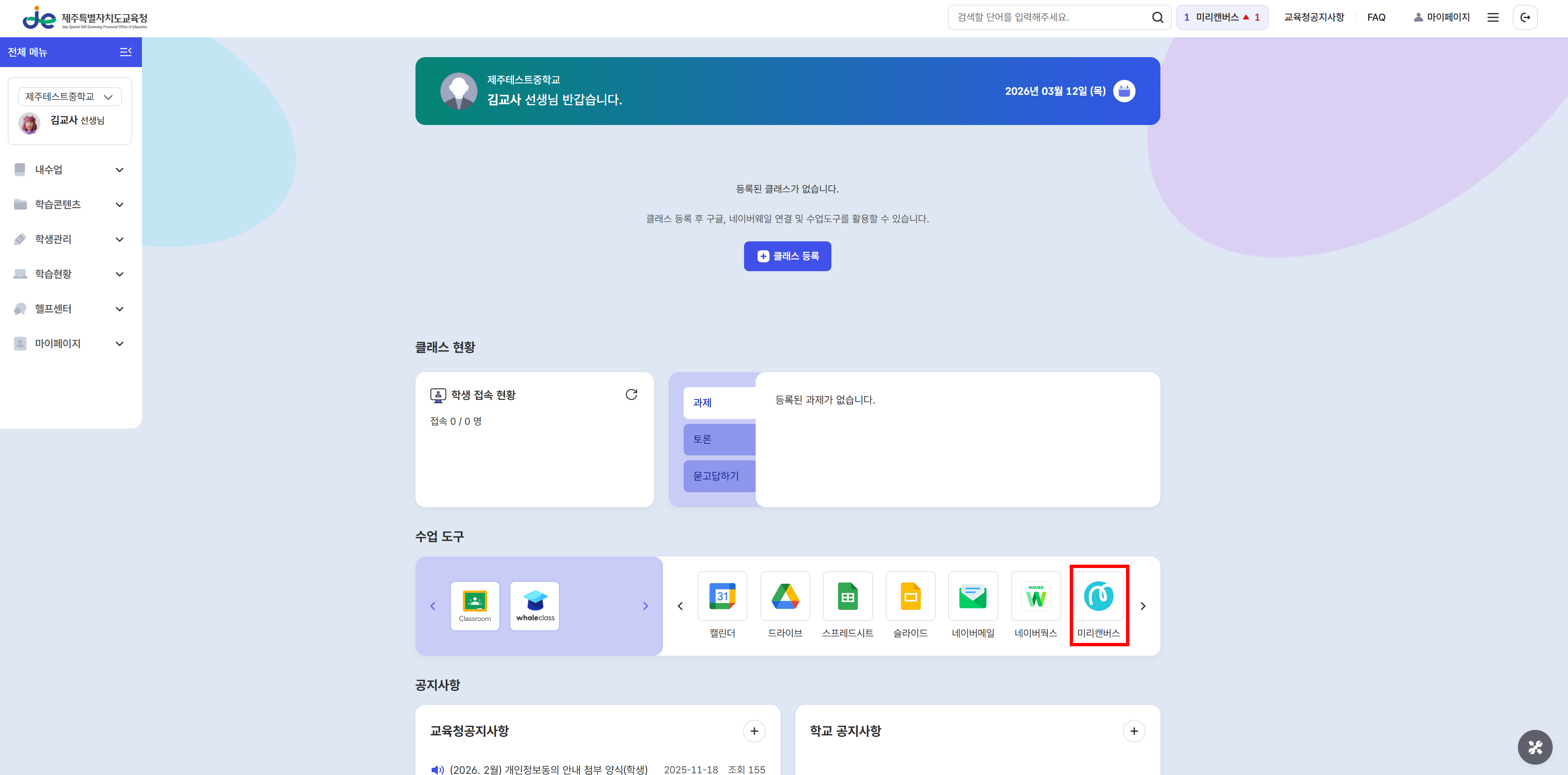 2. 하단의 [수업도구]에서 '미리캔버스'를 선택해주세요.