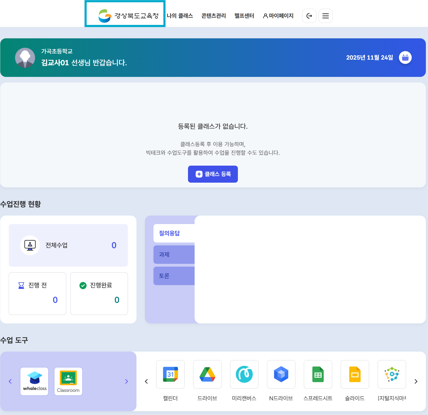2. 중앙 상단 [경상북도 교육청] 로고 클릭 후 오른쪽 하단 [수업 도구]에서 '미리캔버스'를 선택해주세요.