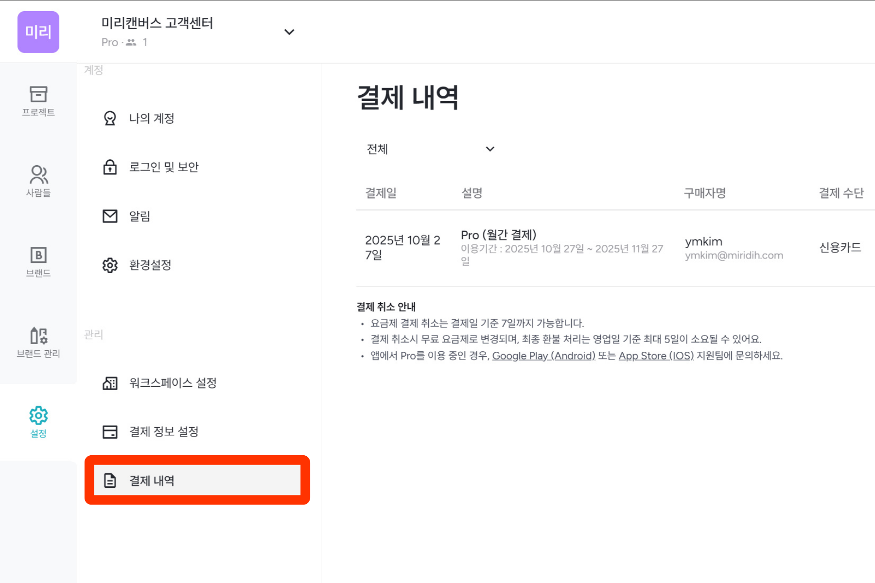 1️⃣워크스페이스의 [ 설정 → 결제 내역 → 더보기(···) → 결제 취소 및 환불 ] 순서로 진행해 주세요.