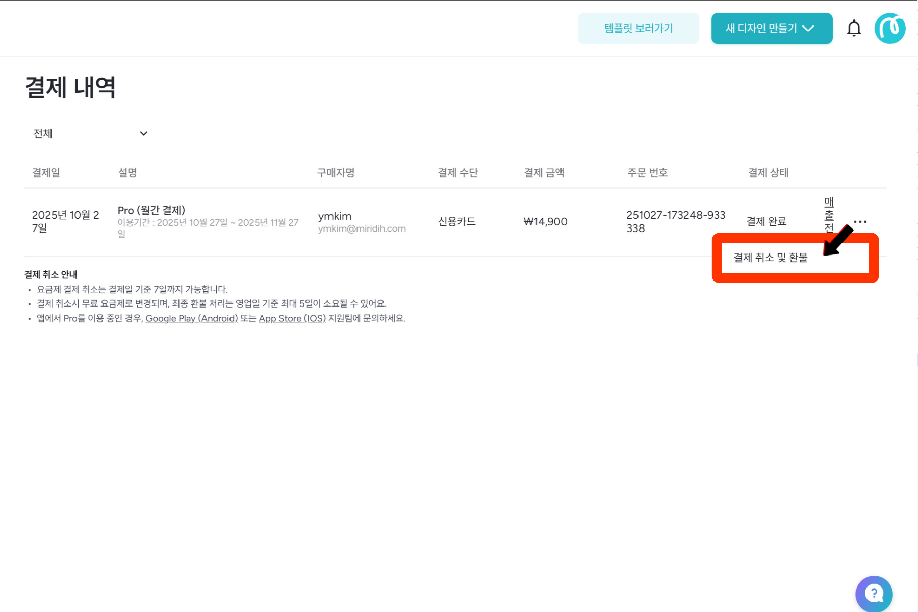 Pro 요금제 결제 후, 결제 취소는 사용하지 않은 상태(문서 생성, 다운로드, 업로드 등 포함)에서 7일 이내에만 가능해요!